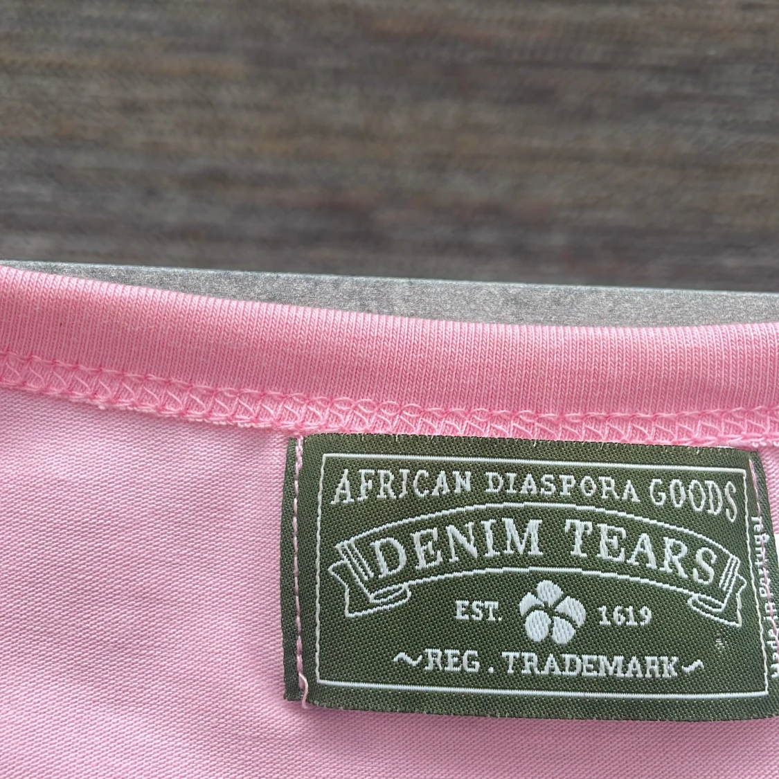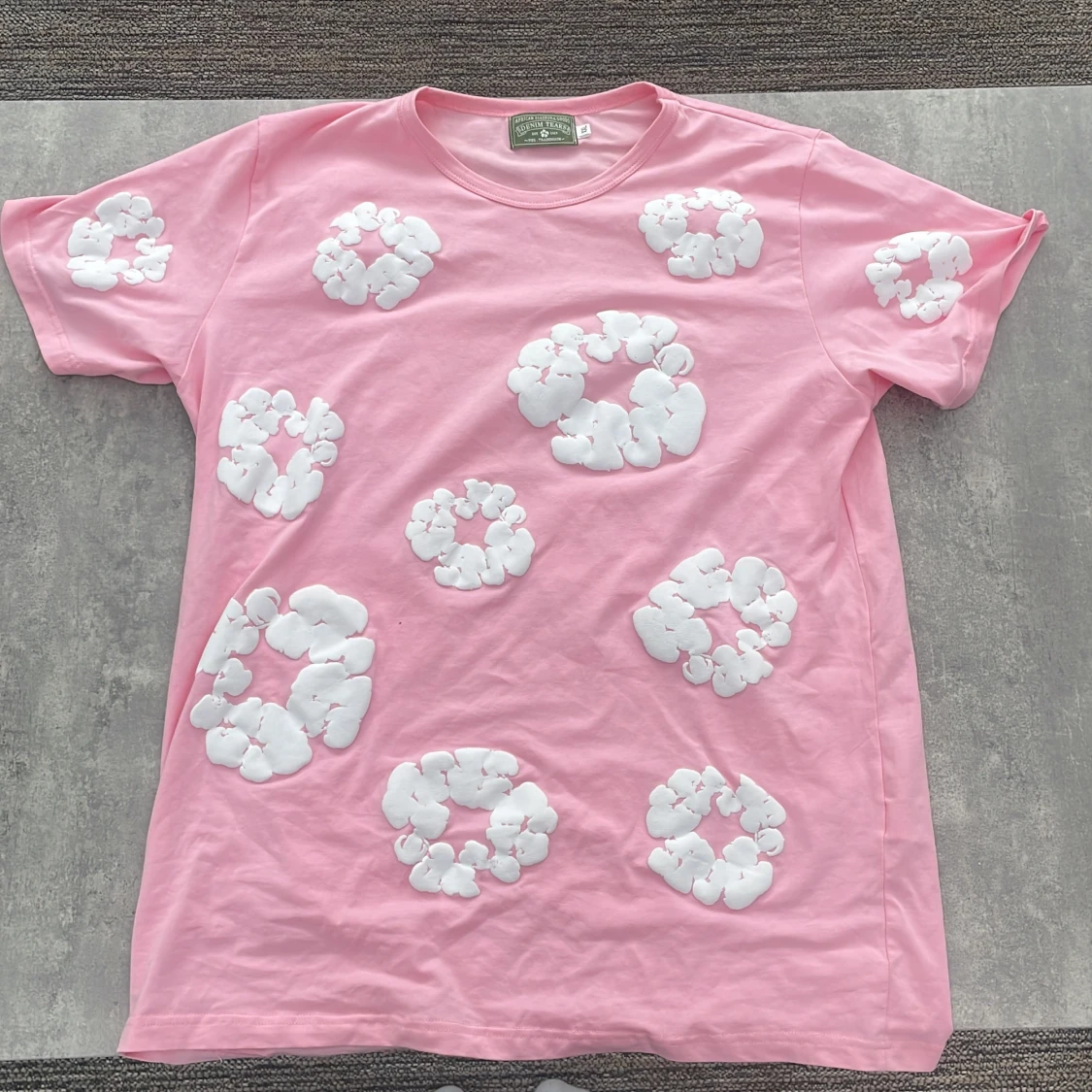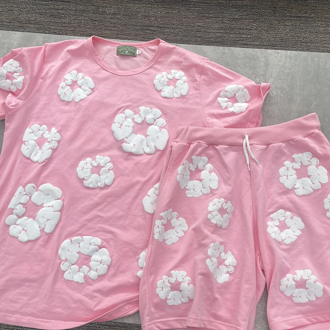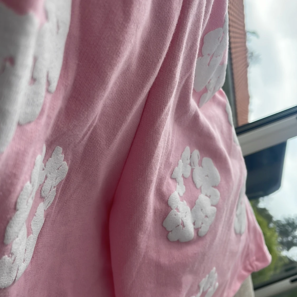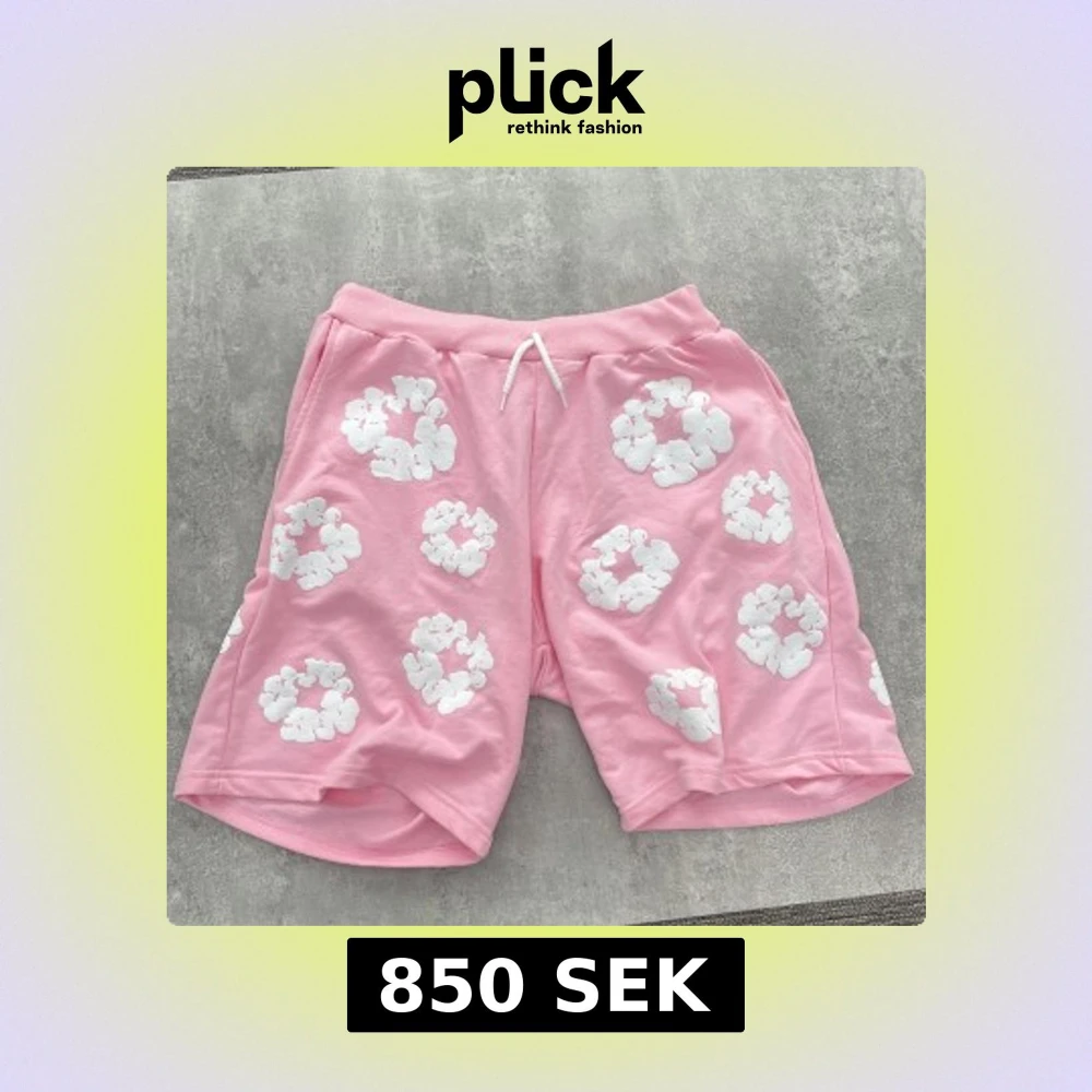 Säljer ett par rosa shorts från Denim Tears med vita blommiga tryck över hela plagget. De har resår i midjan med snörning och är tillverkade i mjuk bomull, perfekta för en chill sommarlook.