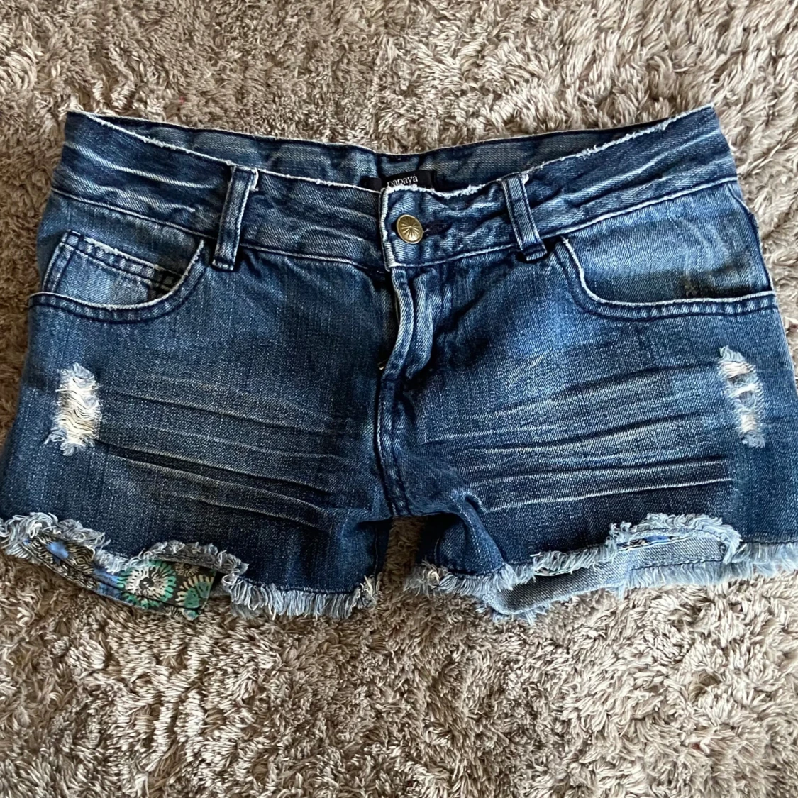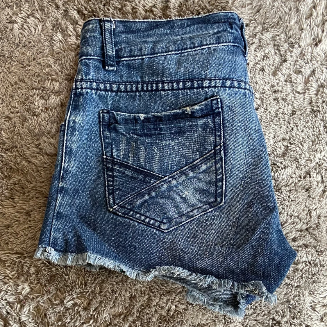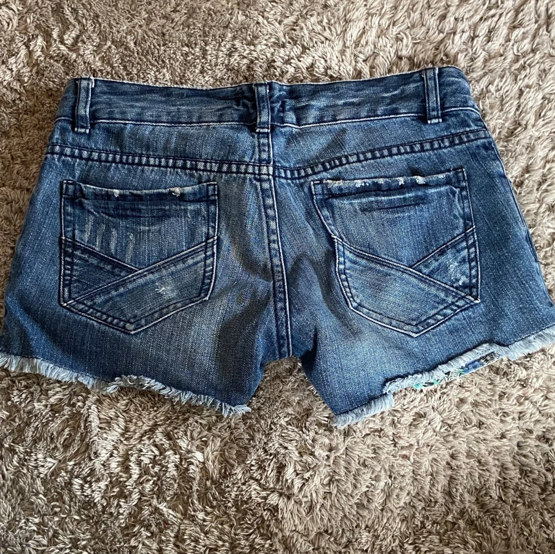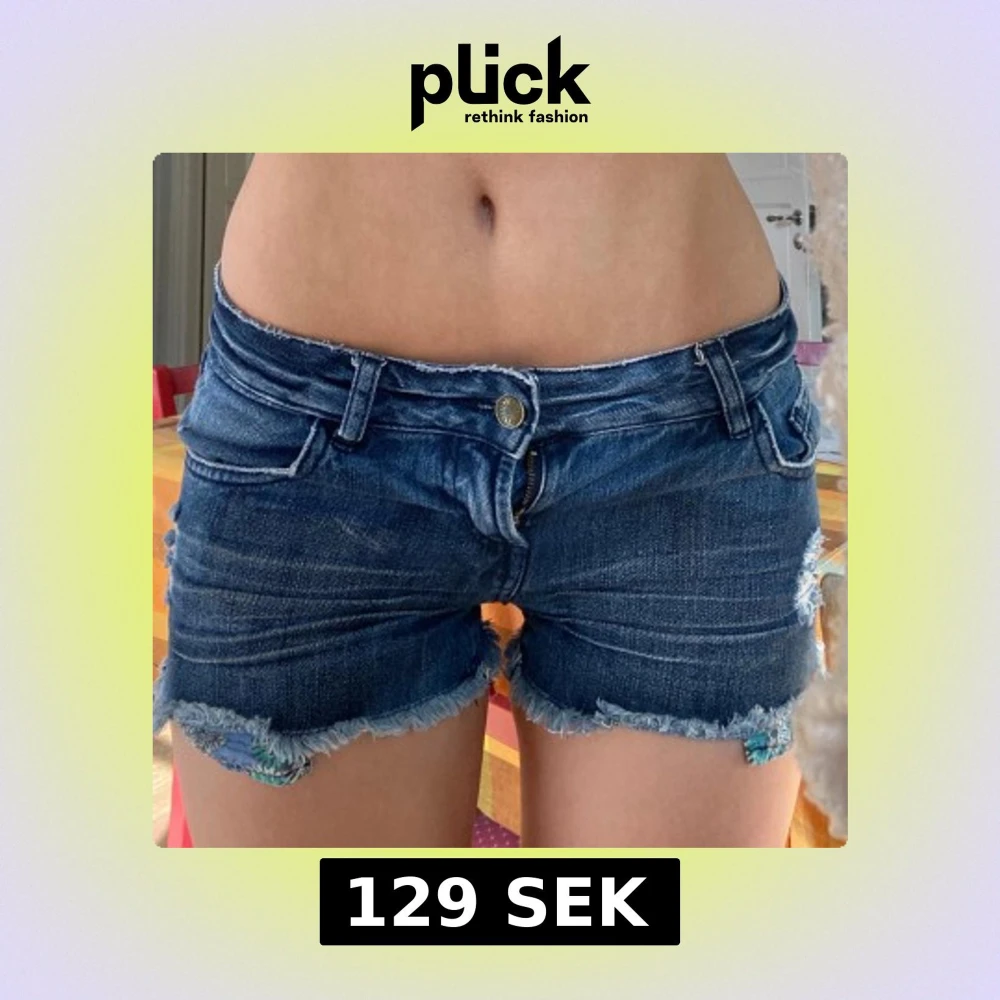 Lågmidjade jeans shorts med super fina fickor!💕 det är en fläck där bak men den syns knappt i verkligheten! Gylfen är också sönder men man kan ha dom nervikta!💗💗midjemåttet är 38 cm rakt över. Hör av er med frågor så svarar jag så fort jag kan☀️