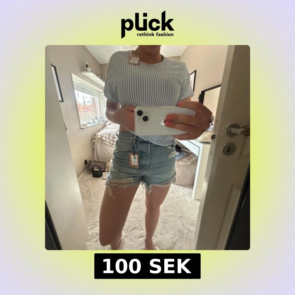 Säljer ett par ljusblå jeansshorts med råa kanter och slitna detaljer framtill. Shortsen har klassisk femficksdesign, knapp och de är Perfekta för varma dagar.