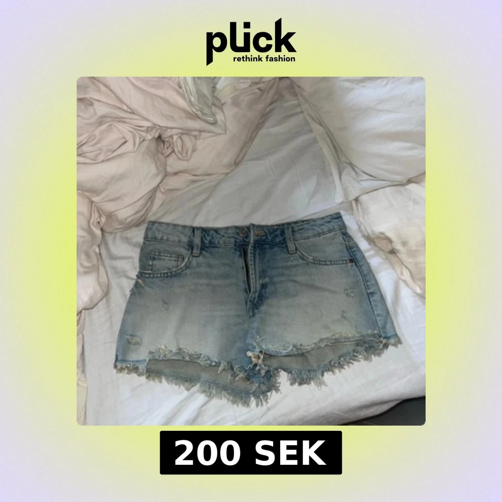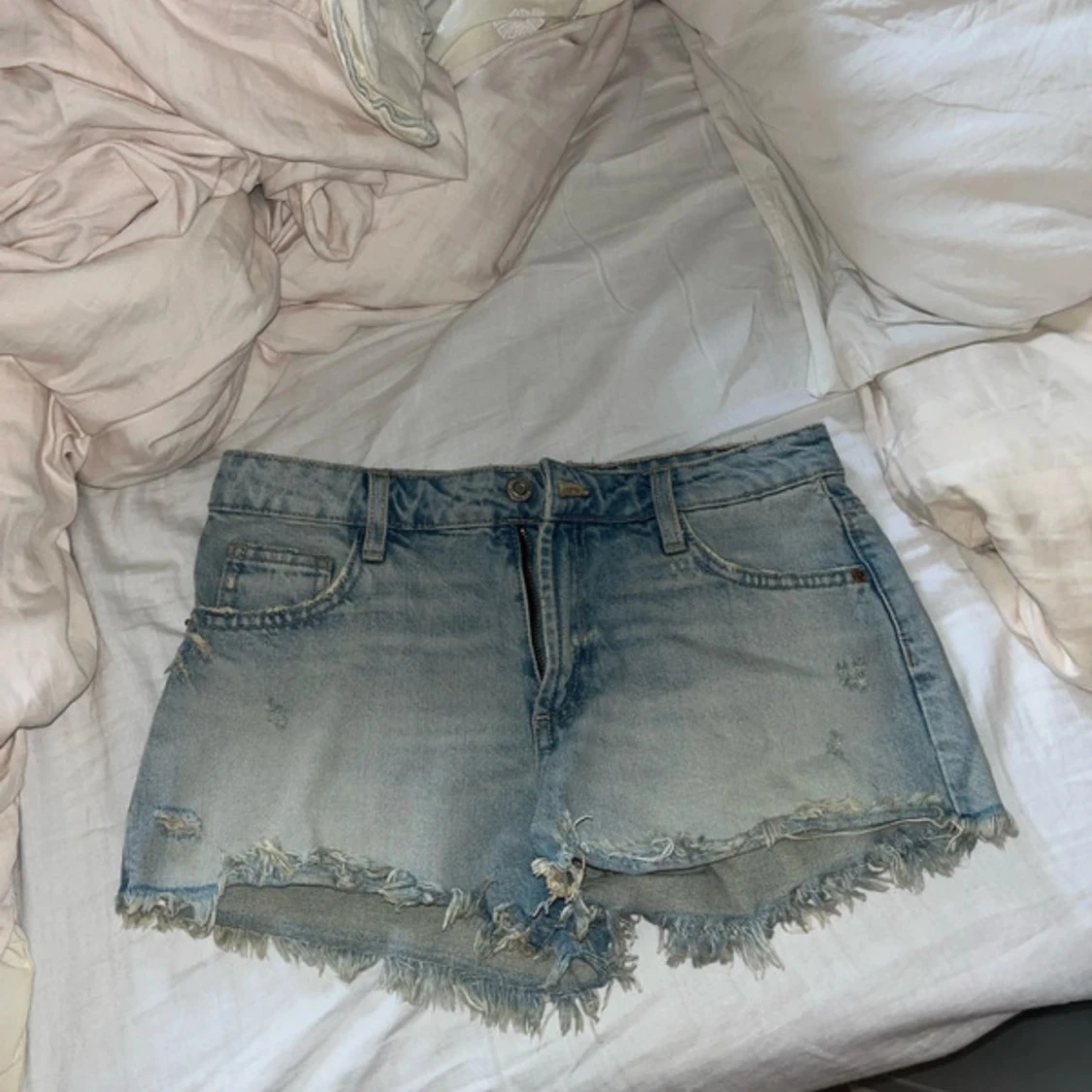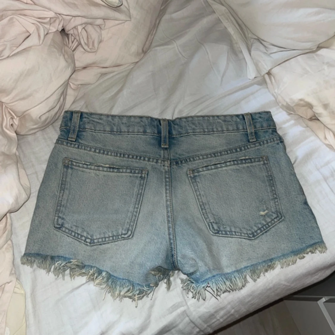 Säljer ett par ljusblå jeansshorts. Shortsen har låg midja och en avslappnad passform, perfekta för varma dagar.