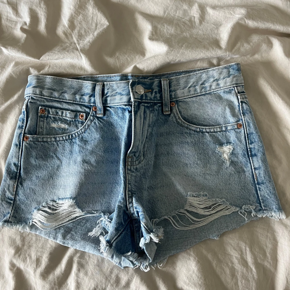 Säljer desda jeansshorts med slitningar, rätt rågmidjade i stolek 34, men skulle tro passar även 36. Från gina tricot och bara använda enstaka gånger.