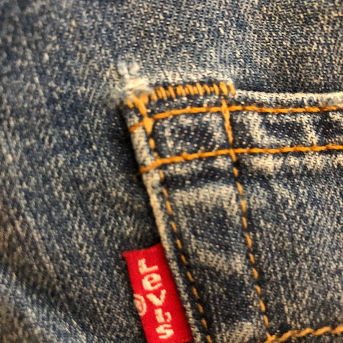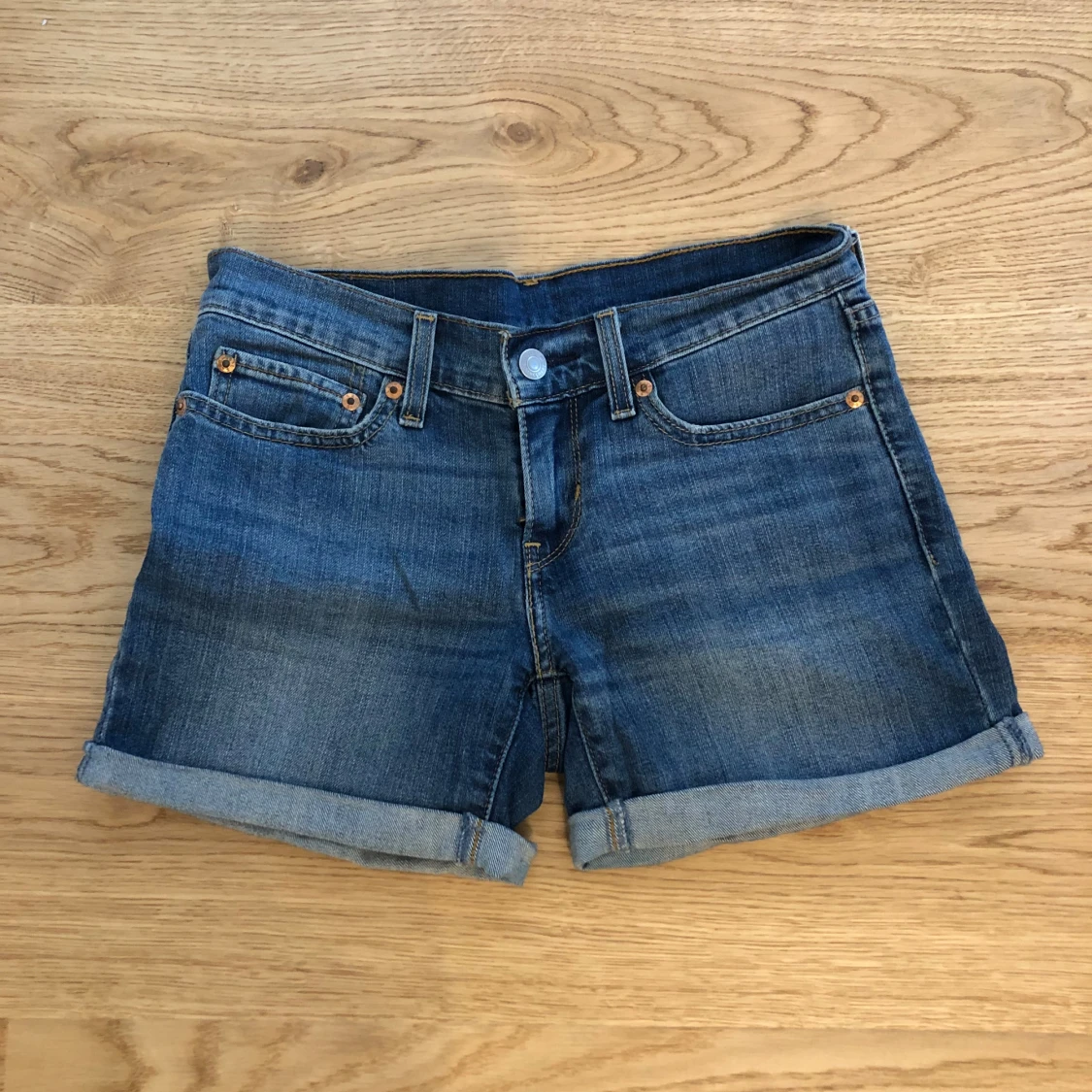 Korta jeansshorts från Levis i bra skick. Storlek W24. Det finns en liten slitning vid högra bakfickan, se bild.