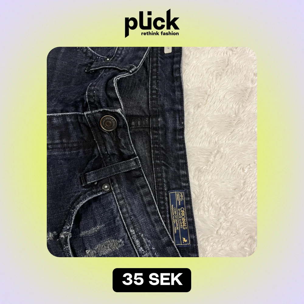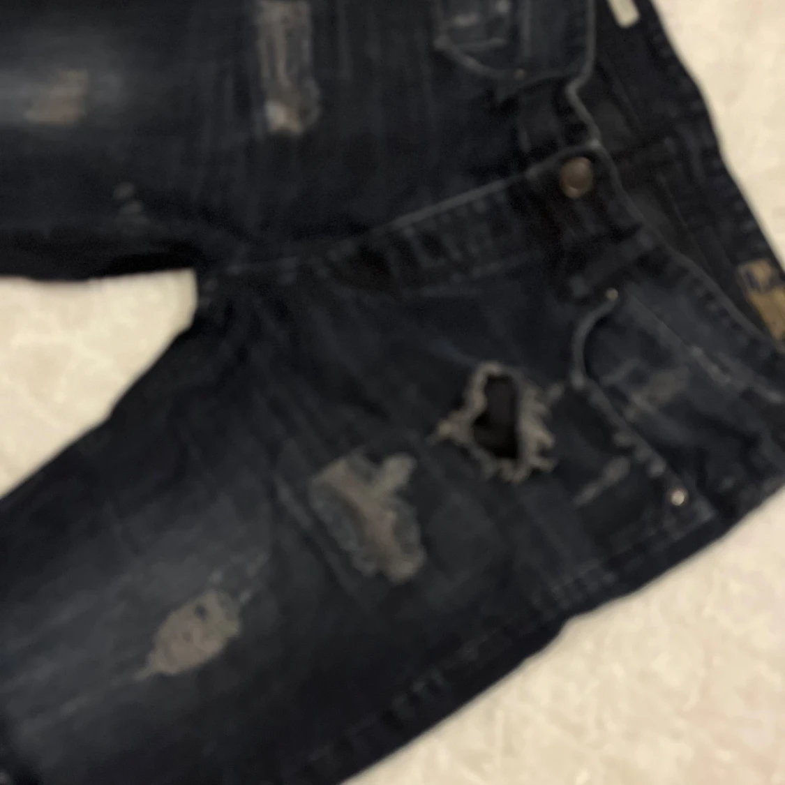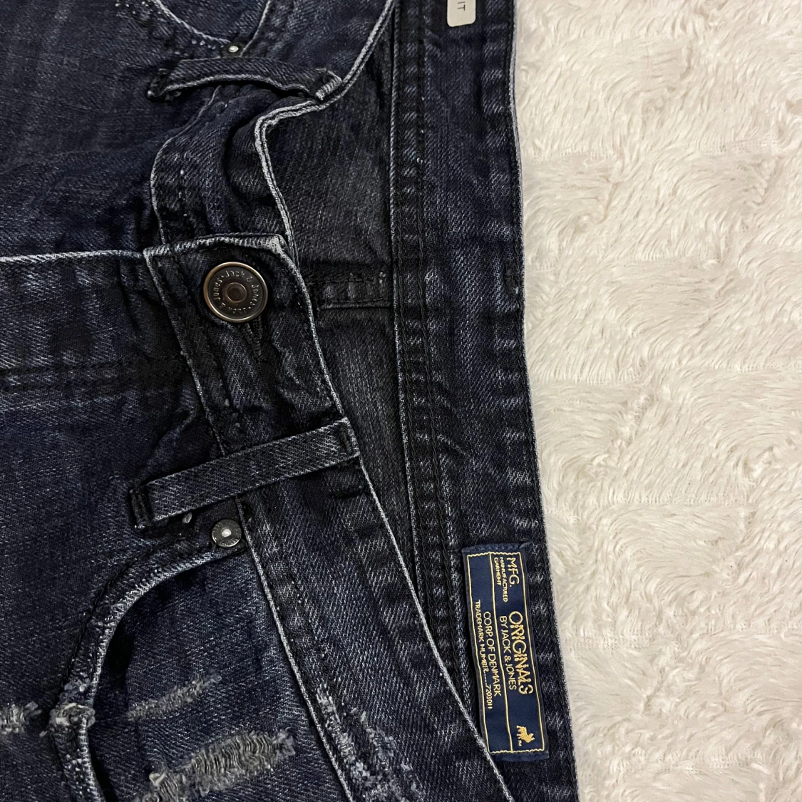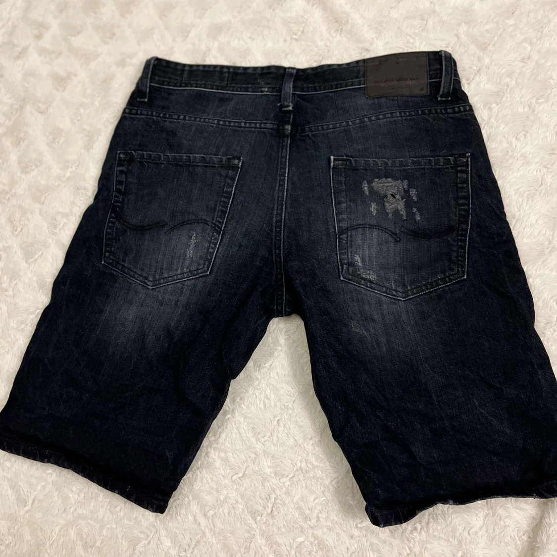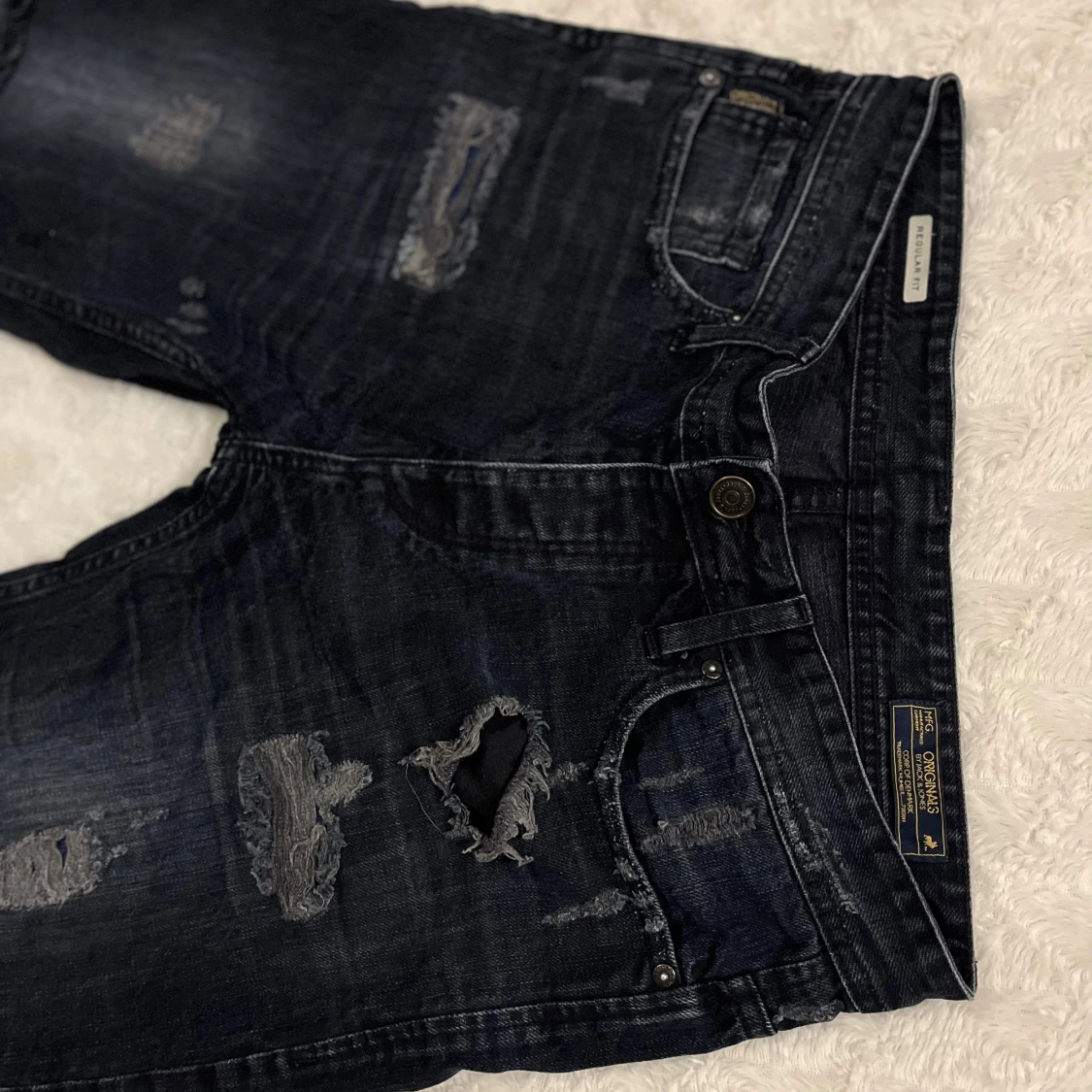 Säljer ett par snygga mörkblå jeansshorts från Jack & Jones i storlek L. De har en cool slitningseffekt och knappar i midjan. Perfekta för en avslappnad sommarlook. Passar bra till både t-shirt och skjorta!