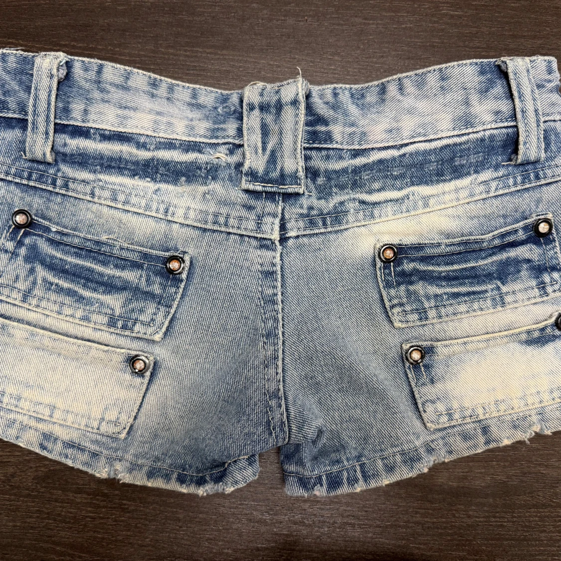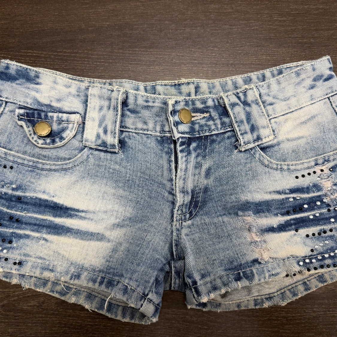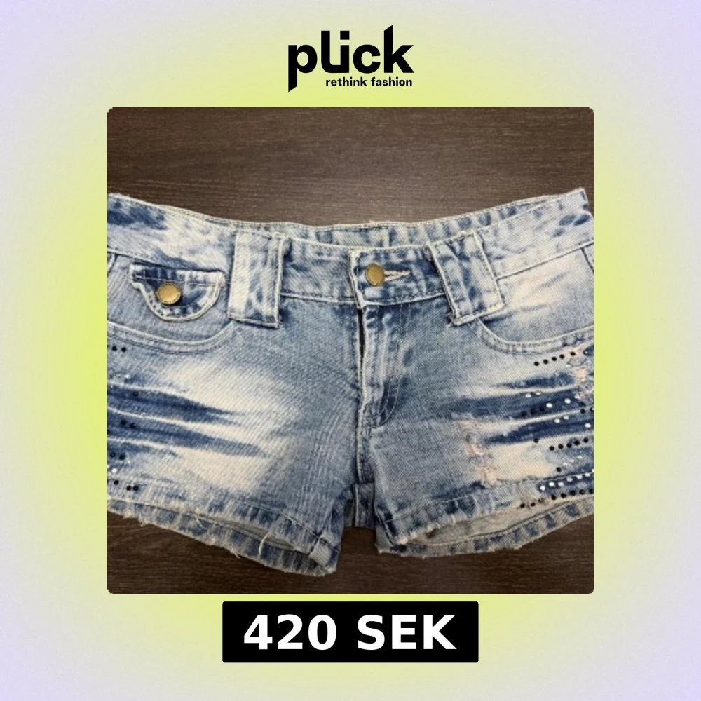 Snygga ljusblå jeansshorts med slitna detaljer och paljetter, jättefina nu till sommaren. Midjemåttet rakt över är 35 cm. Obs! Jag är på semester och kan därmed skicka tidigast 28/6