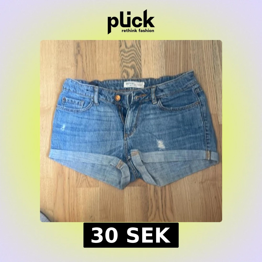 Säljer ett par klassiska blå jeansshorts med upprullad kant och femficksmodell. Shortsen har knapp och dragkedja framtill samt bälteshällor.