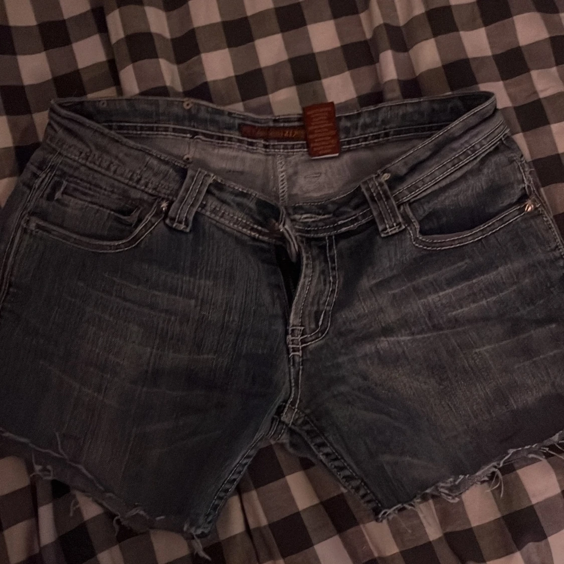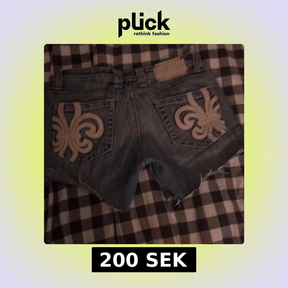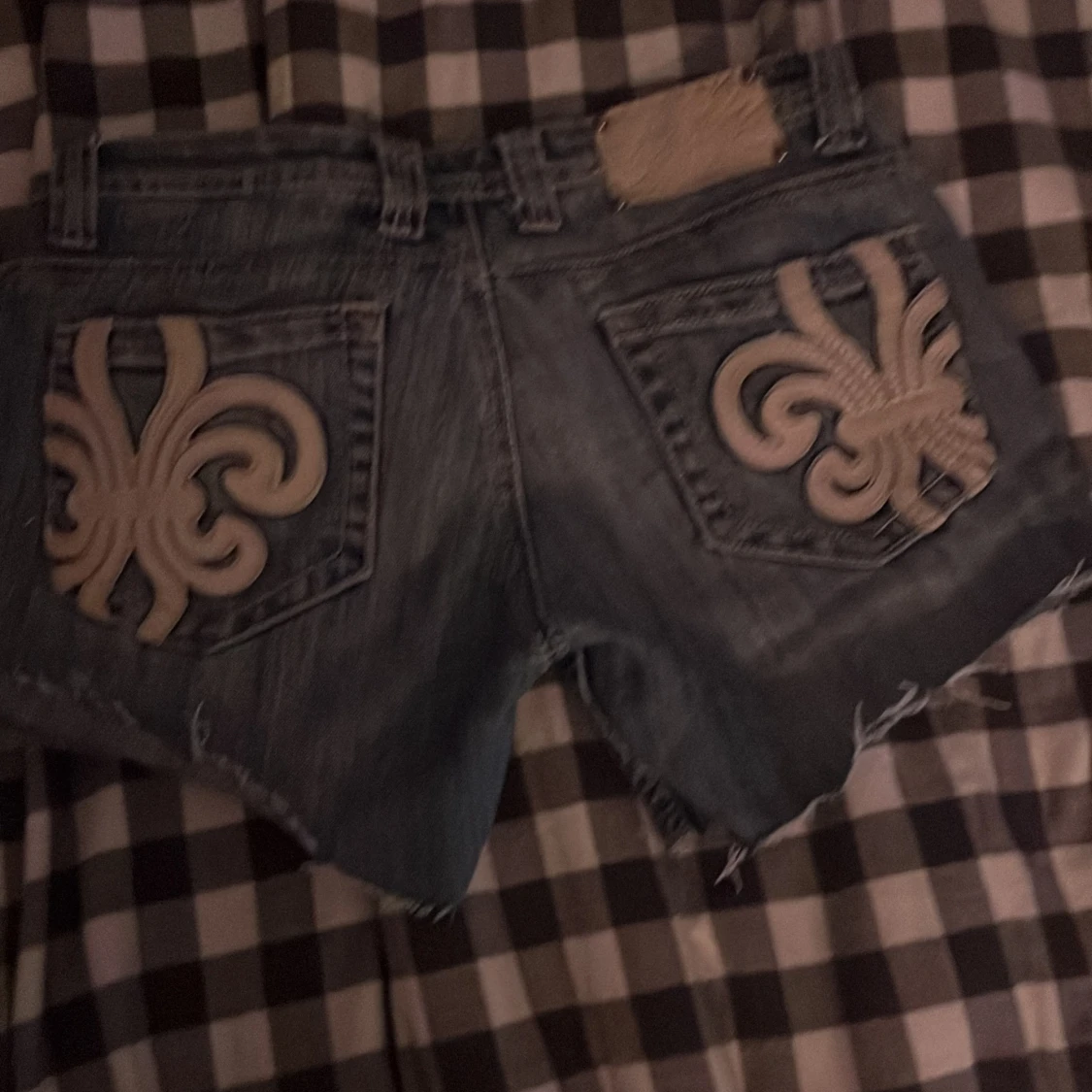 Snygga blå jeansshorts med råa kanter och stora, broderade mönster på bakfickorna. Shortsen har klassisk femficksdesign, bälteshällor och dragkedja. Perfekta för sommaren och ger en cool, avslappnad vibe.