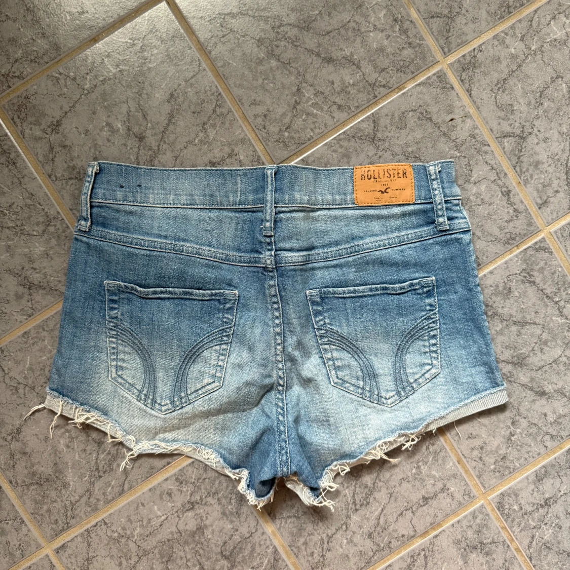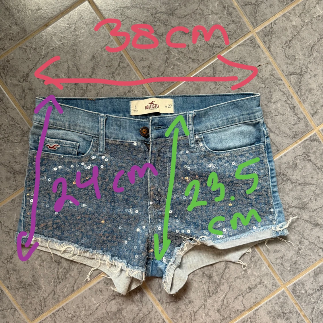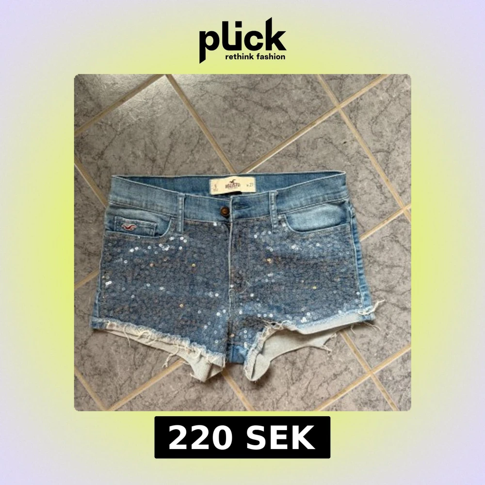 Blå jeansshorts från Hollister med snygga paljettdetaljer framtill och råa, fransiga kanter. Klassisk femficksmodell, låg midja och normal passform. Perfekta för sommaren när du vill sticka ut lite extra.
