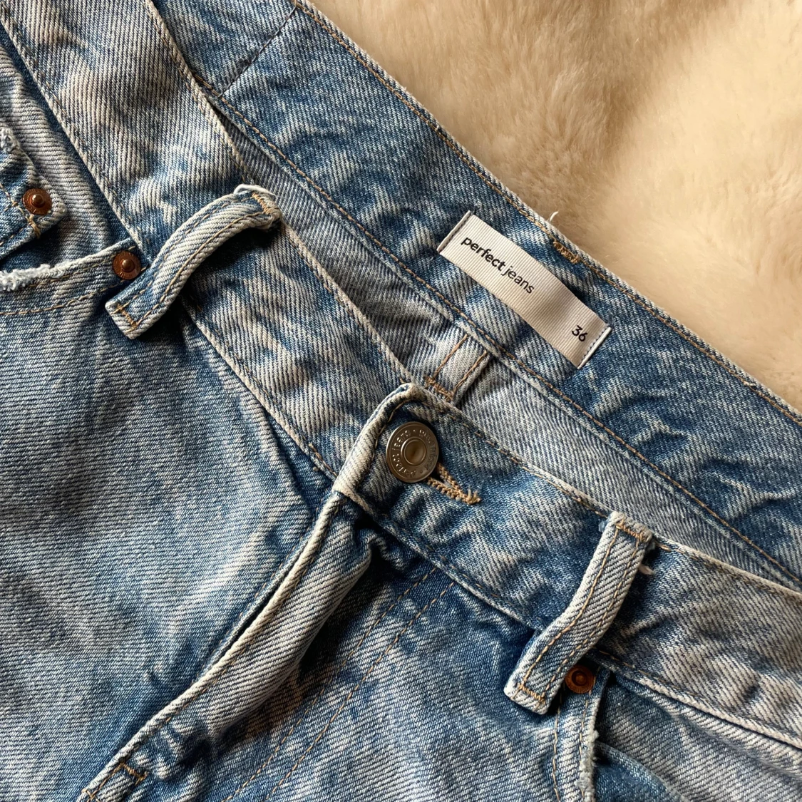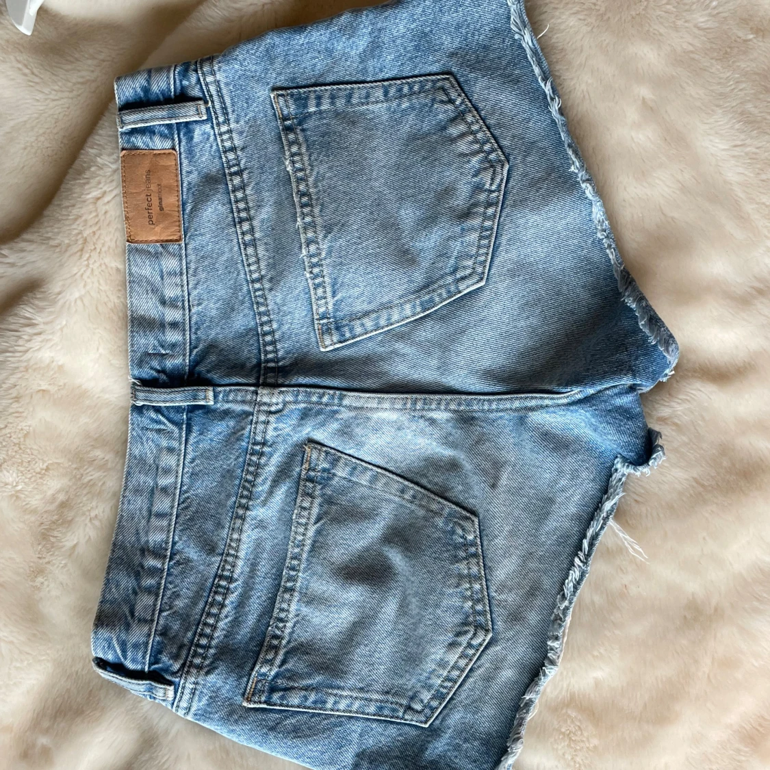 Snygga blå jeansshorts från Perfect Jeans med fransiga kanter och slitna detaljer. Klassisk femficksmodell med knapp och dragkedja framtill. Perfekt för sommarens alla äventyr, passar dig som gillar en avslappnad och cool stil.