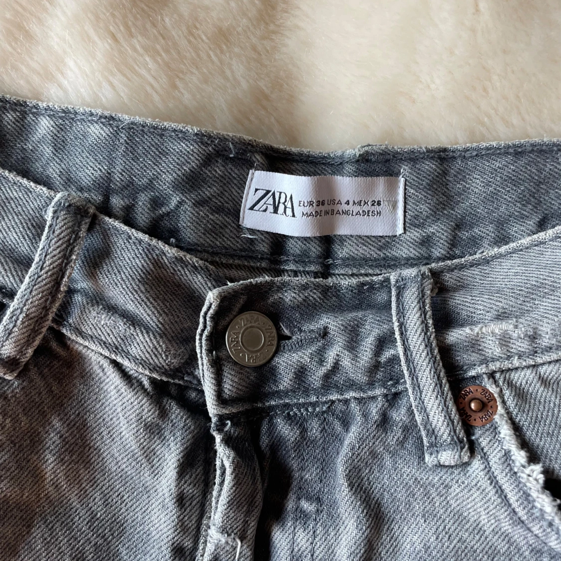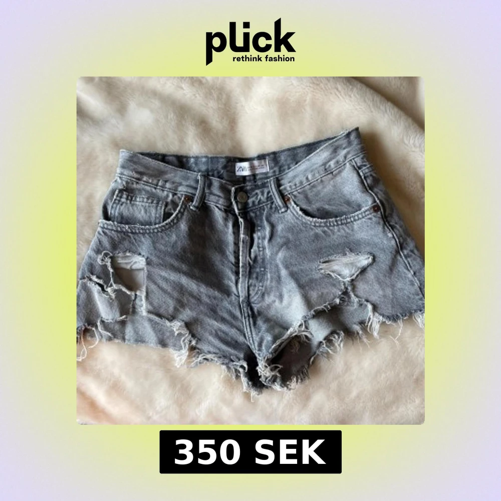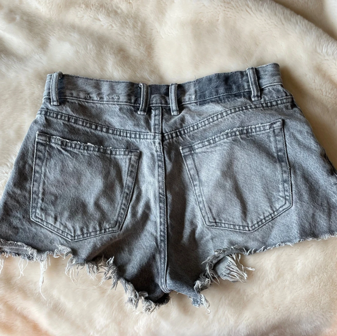 Säljer ett par grå jeansshorts från Zara i storlek 36. De har hög midja, råa och fransiga kanter samt slitna detaljer med hål framtill. Klassisk femficksmodell med knapp och dragkedja. Perfekt för dig som gillar en edgy och avslappnad stil.