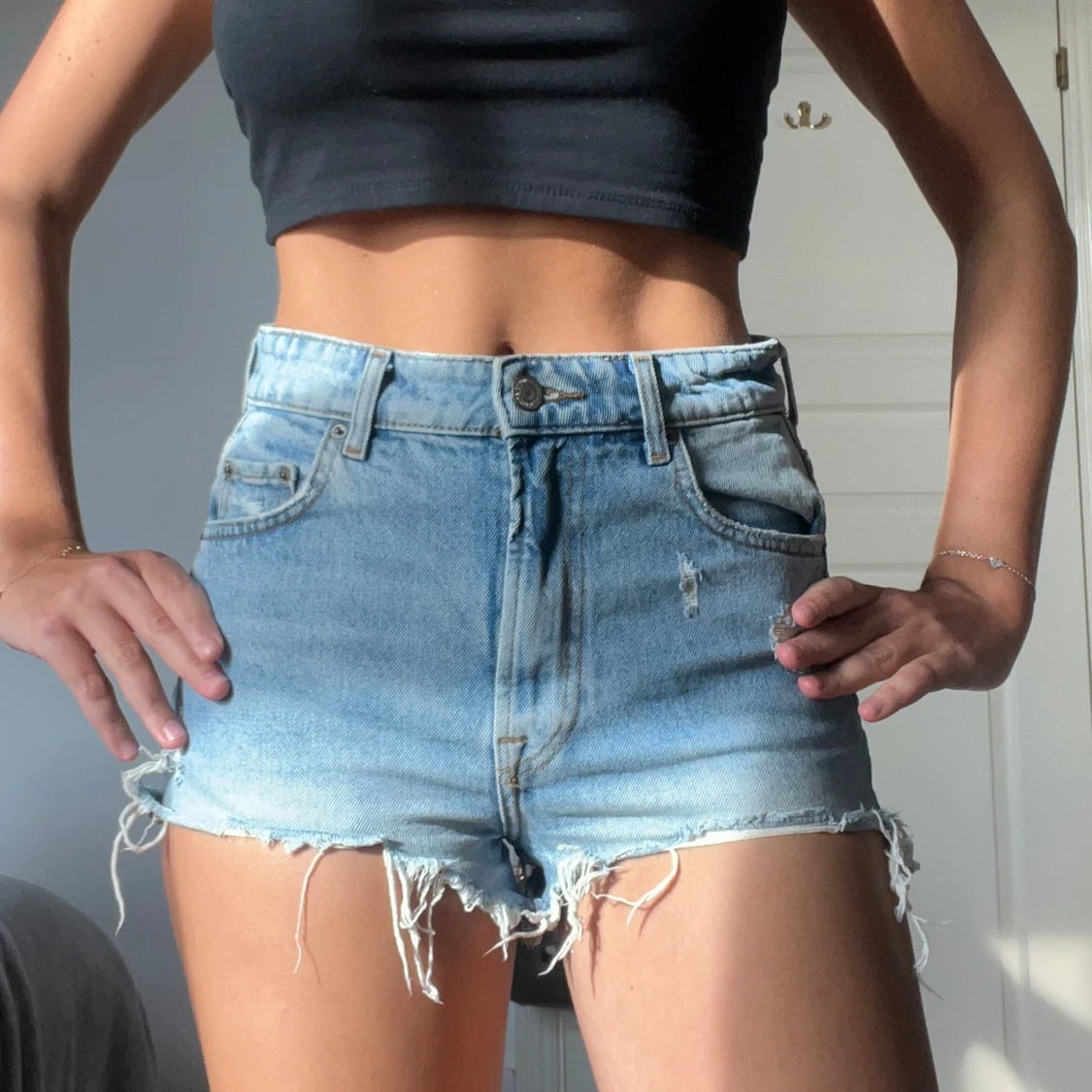 Snygga blå jeansshorts med fransiga kanter och slitna detaljer. Dom är högmidjade!