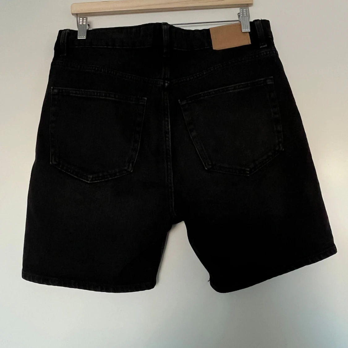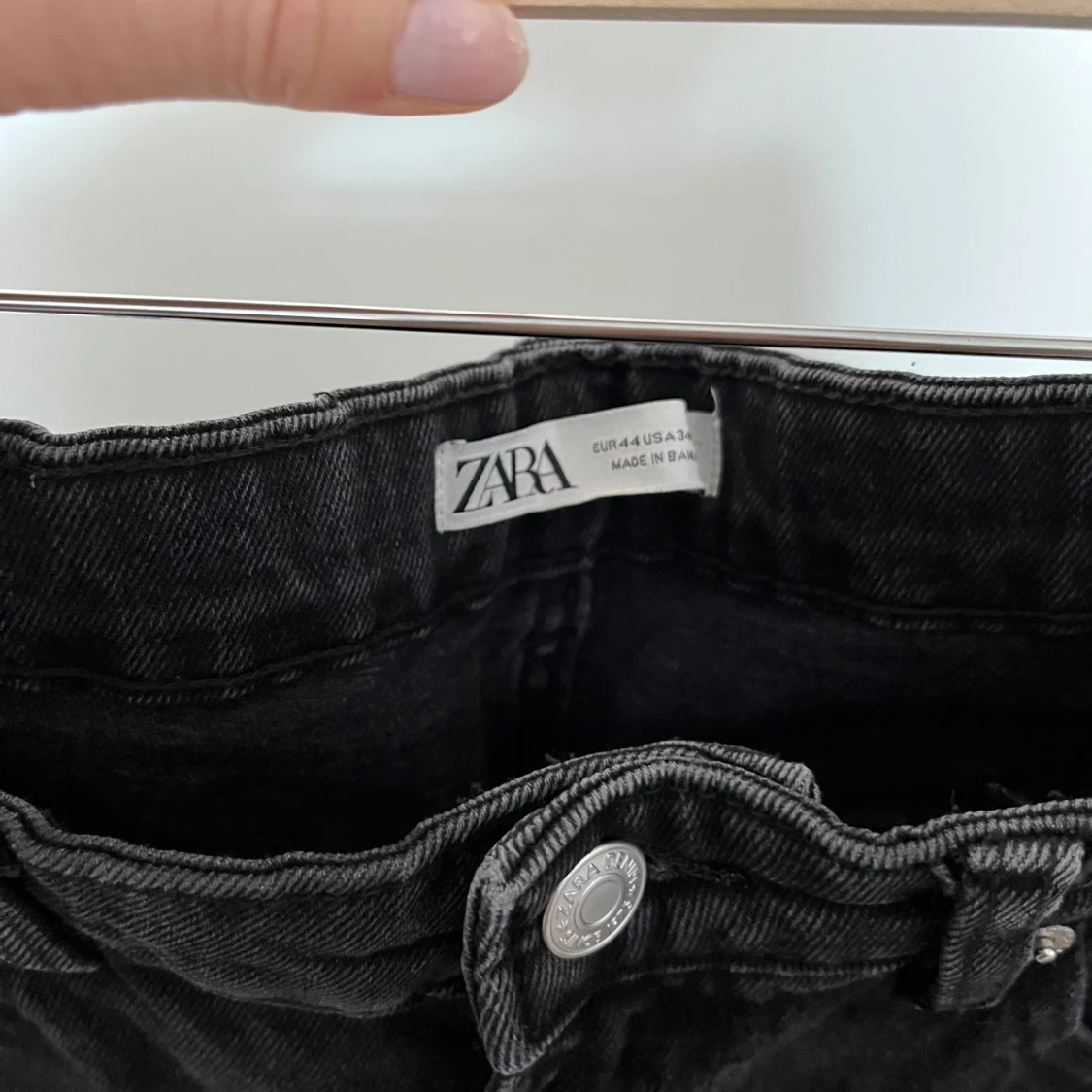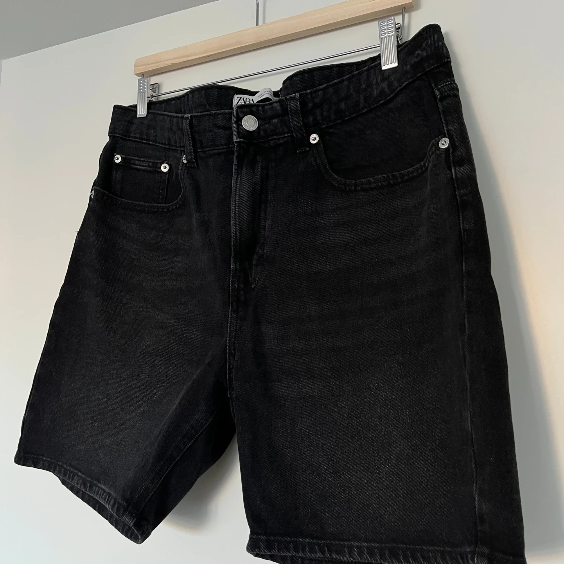Jeansshorts från ZARA i storlek 44, svarta/mörkgråa. Mycket bra skick, som nya. Mått: Yttre längd ca 48 cm Inre längd ca 17 cm Midja ca 45,5 cm Stuss ca 50 cm