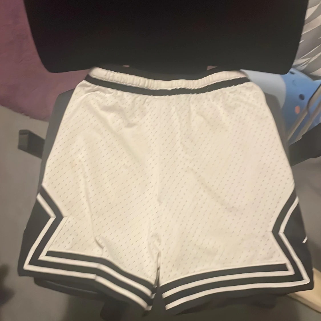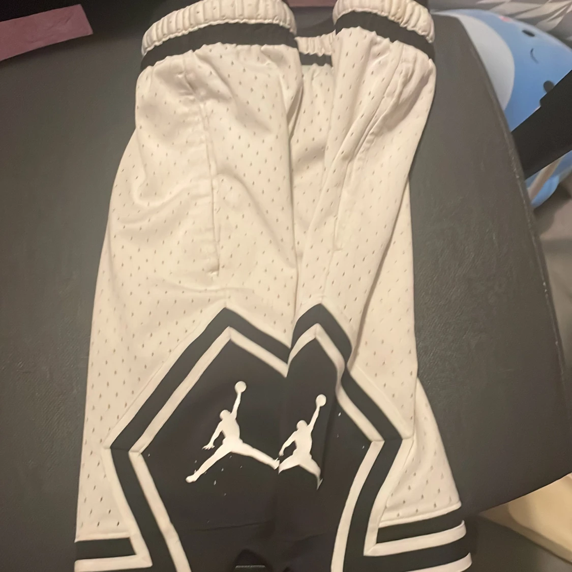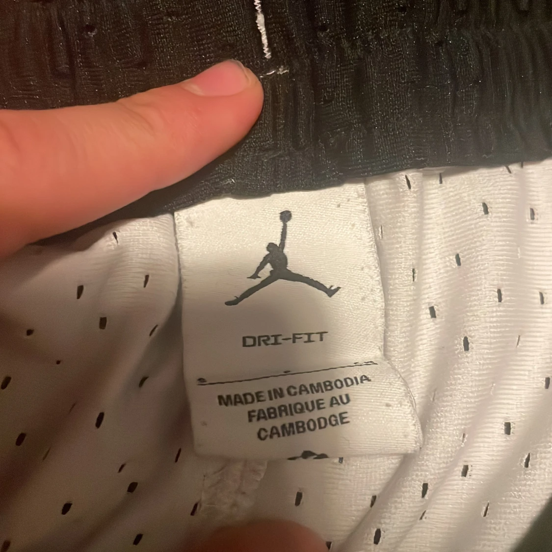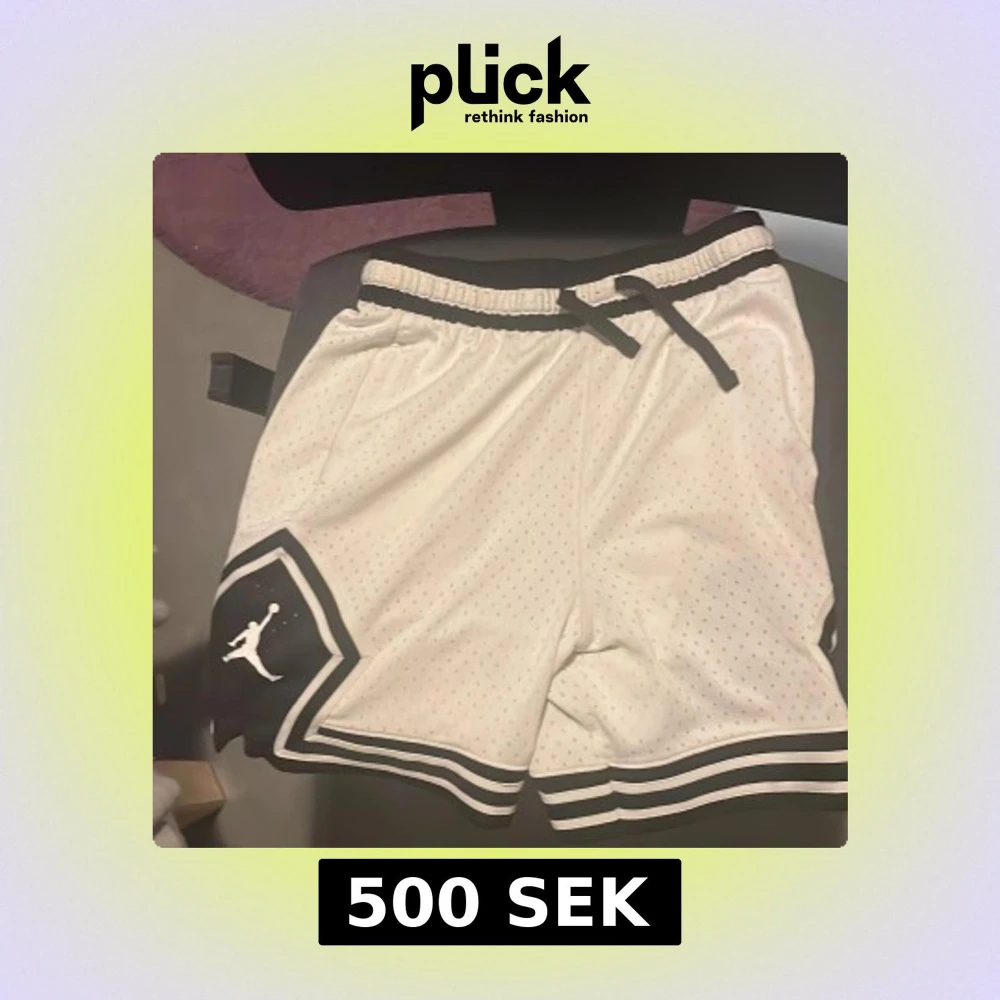 Snygga vita Jordan shorts med svart kant och klassisk Jumpman-logga på benen. Tillverkade i Dri-Fit material som andas och har snörning i midjan. Perfekta för träning eller sportiga outfits.