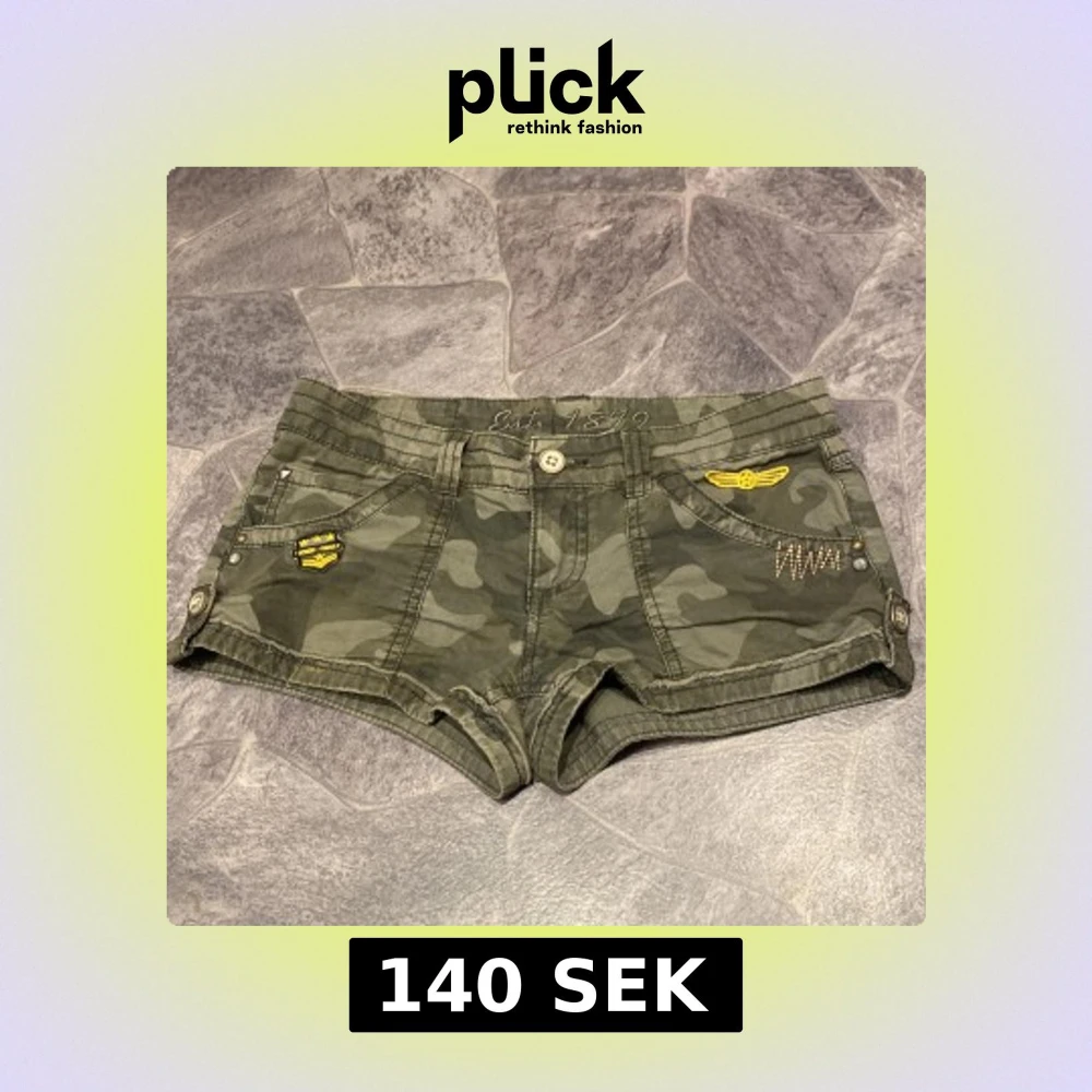 Snygga Mini kamouflage shorts med coola broderade detaljer och knappar. Perfekta för en avslappnad stil. De har flera fickor och en knappstängning fram.