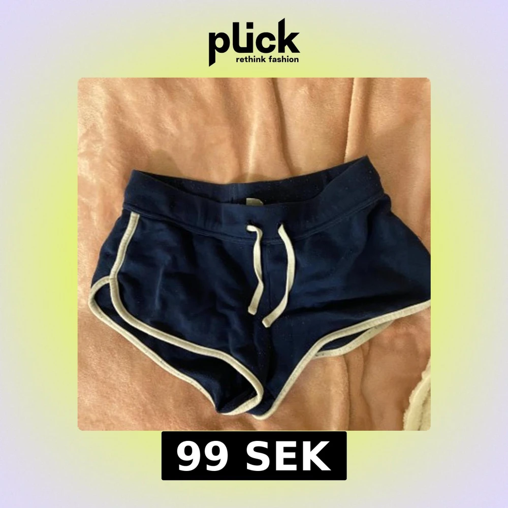 Ett par korta mörkblåa mjukis shorts. Man kan vika ned dom så att de blir mer lågmidjade.
