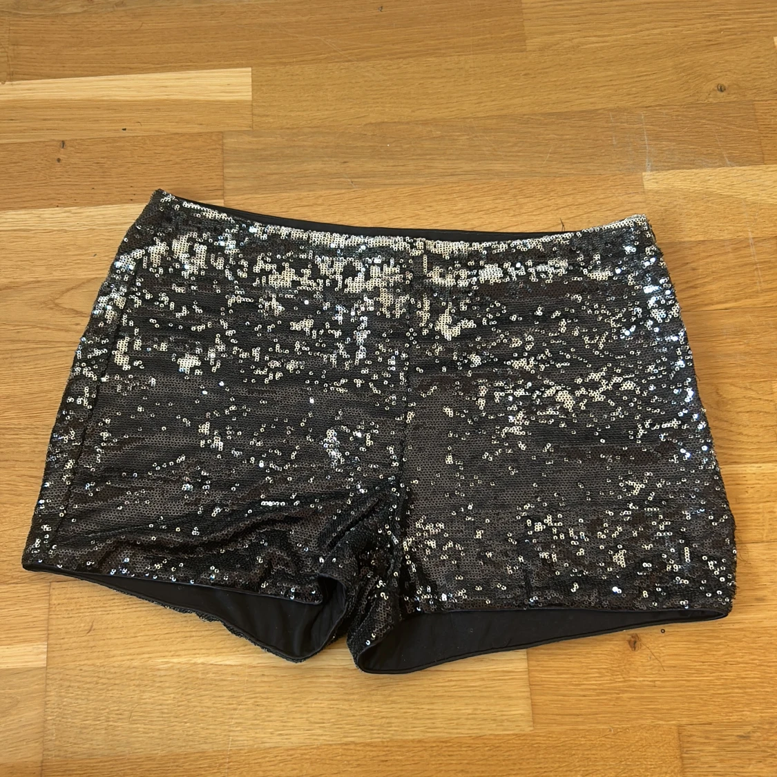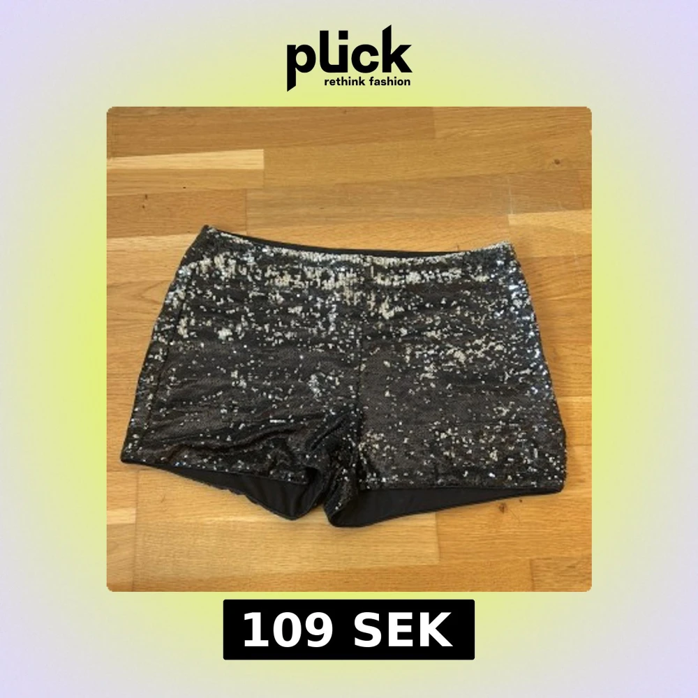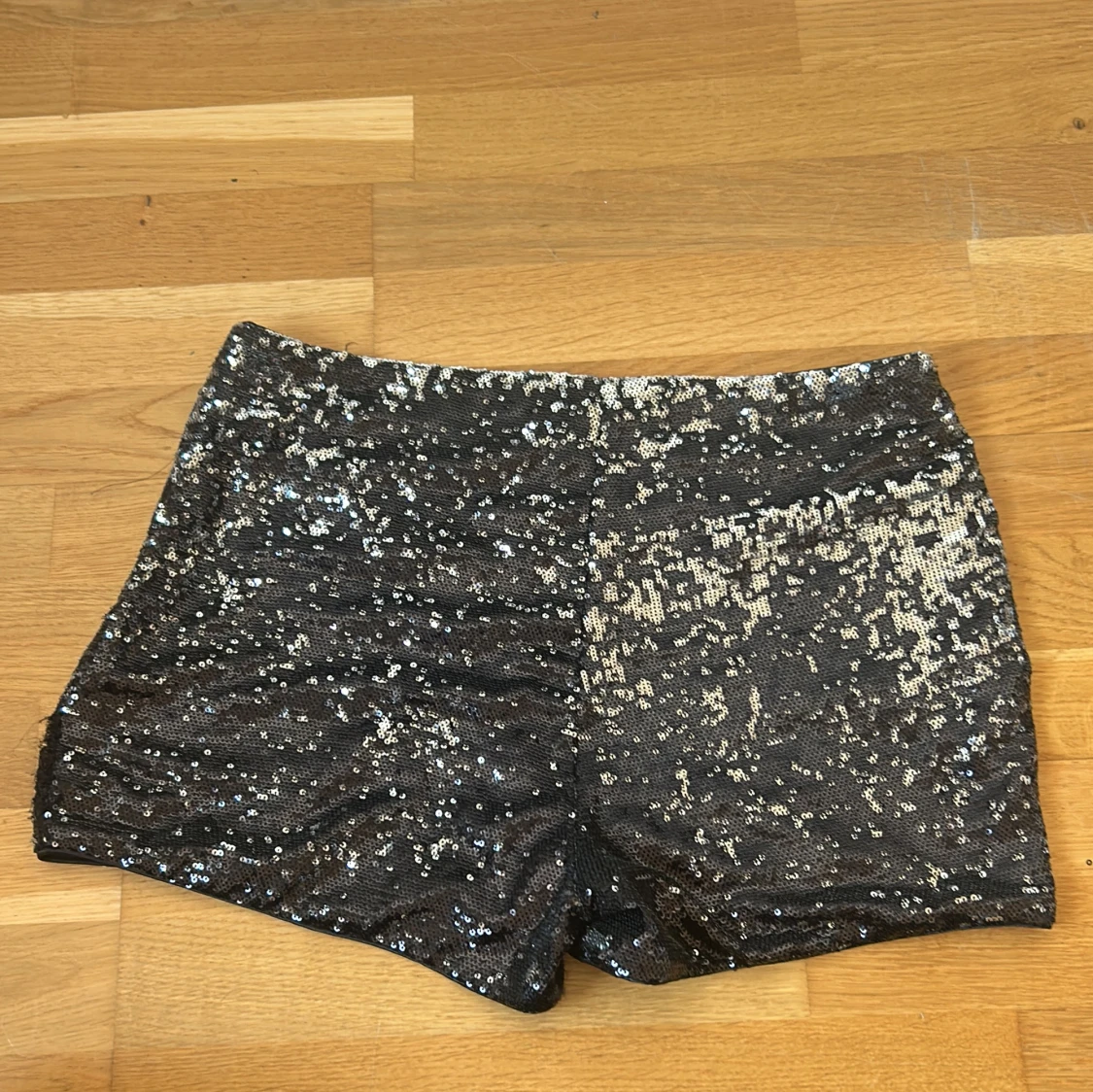 Glittriga svarta shorts från Amisu, täckta med silvriga paljetter som ger en riktigt festlig vibe. Modellen är kort och har en slim passform med elastisk midja. Perfekta för att sticka ut och glänsa på nästa event. Materialet är mjukt på insidan och paljetterna täcker hela ytan. Den är lite sliten på sidan men inget som är sönder helt igenom.