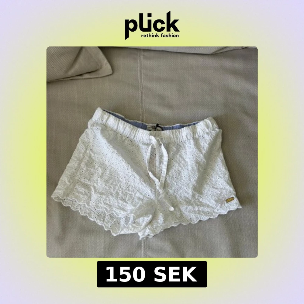 Säljer ett par vita shorts med broderade detaljer och knytband i midjan. De har en söt volangkant nedtill och är tillverkade i bomull. Perfekta för varma sommardagar