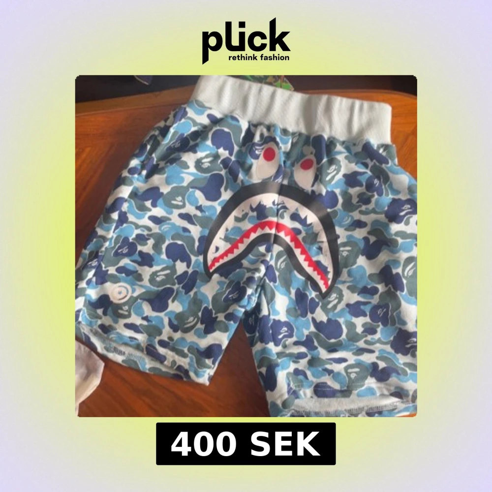 Säljer ett par blå camo-shorts från BAPE med ikoniskt hajansikte framtill. Shortsen har bred resår i midjan och är perfekta för en streetwear-look. Färgerna går i olika blå nyanser med vita och svarta detaljer.