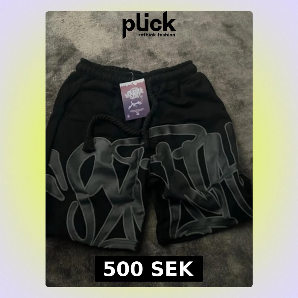 Svarta shorts med stort grått graffiti-inspirerat tryck över hela framsidan. De har elastisk midja med snörning och är perfekta för en streetwear-look. Materialet känns mjukt och bekvämt, och shortsen har en avslappnad passform.
