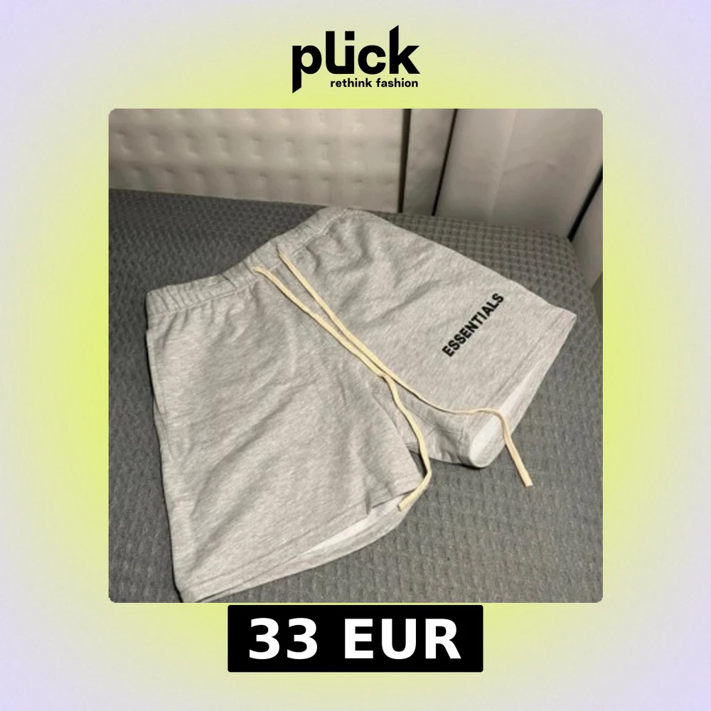 Snygga ljusgrå shorts från Essentials Fear of God med svart logga på ena benet. De har resår i midjan och långa snören framtill för justering. Perfekta för en avslappnad stil.