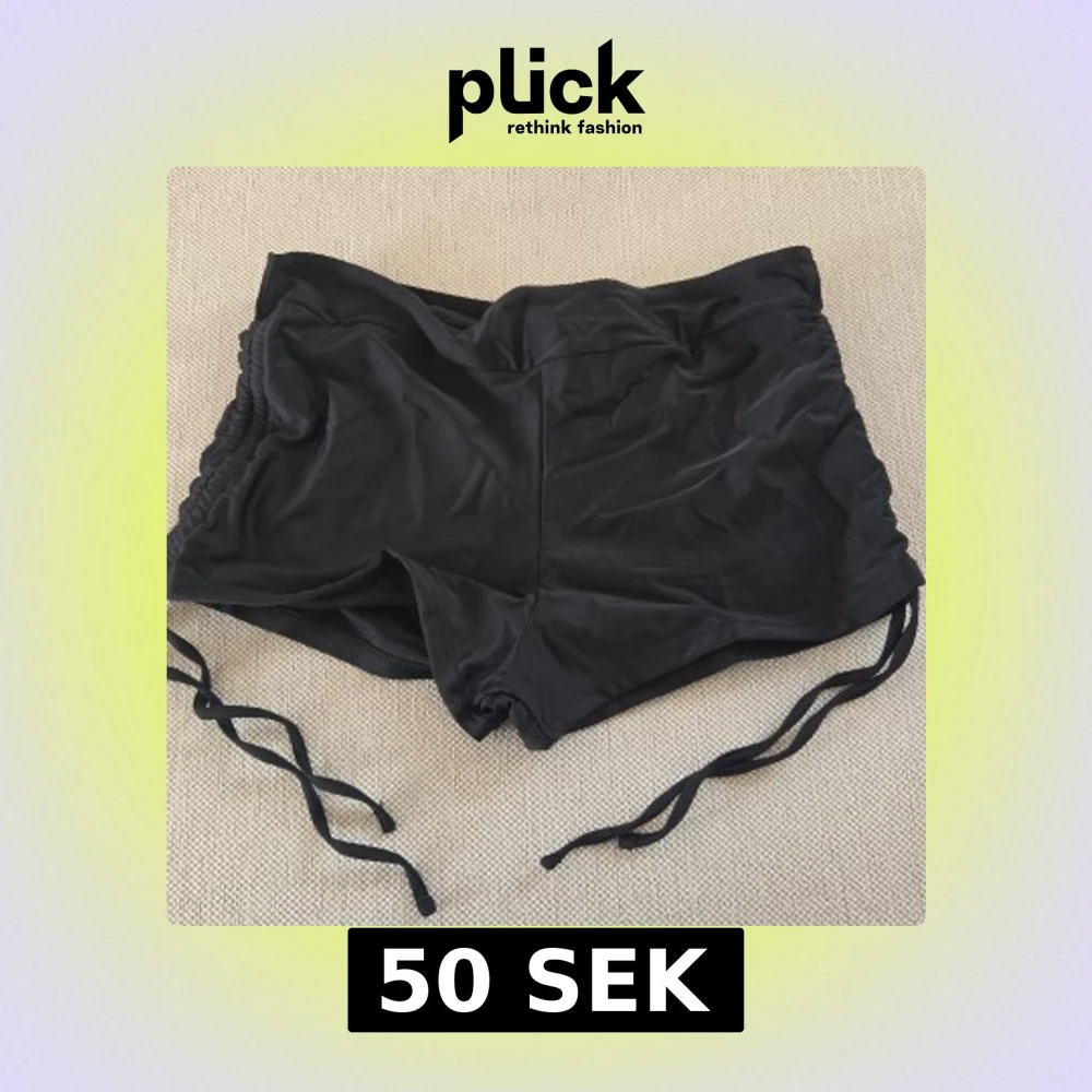 Svarta shorts i stretchigt material med snygg snörning i sidorna. De är korta och har en tight passform, perfekta för träning eller dans. Materialet är mjukt och följsamt, tillverkat av nylon och spandex för maximal rörelsefrihet. Använda en gång.