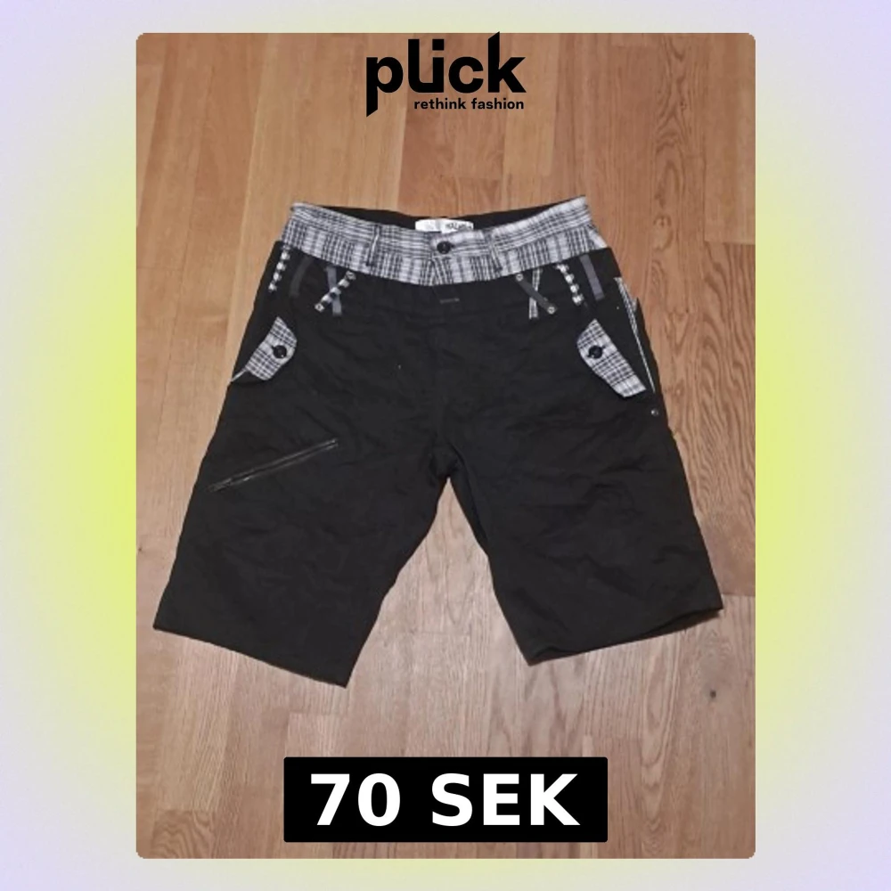 Svarta shorts från Halham med gråsvart rutigt mönster i midjan och på fickorna.