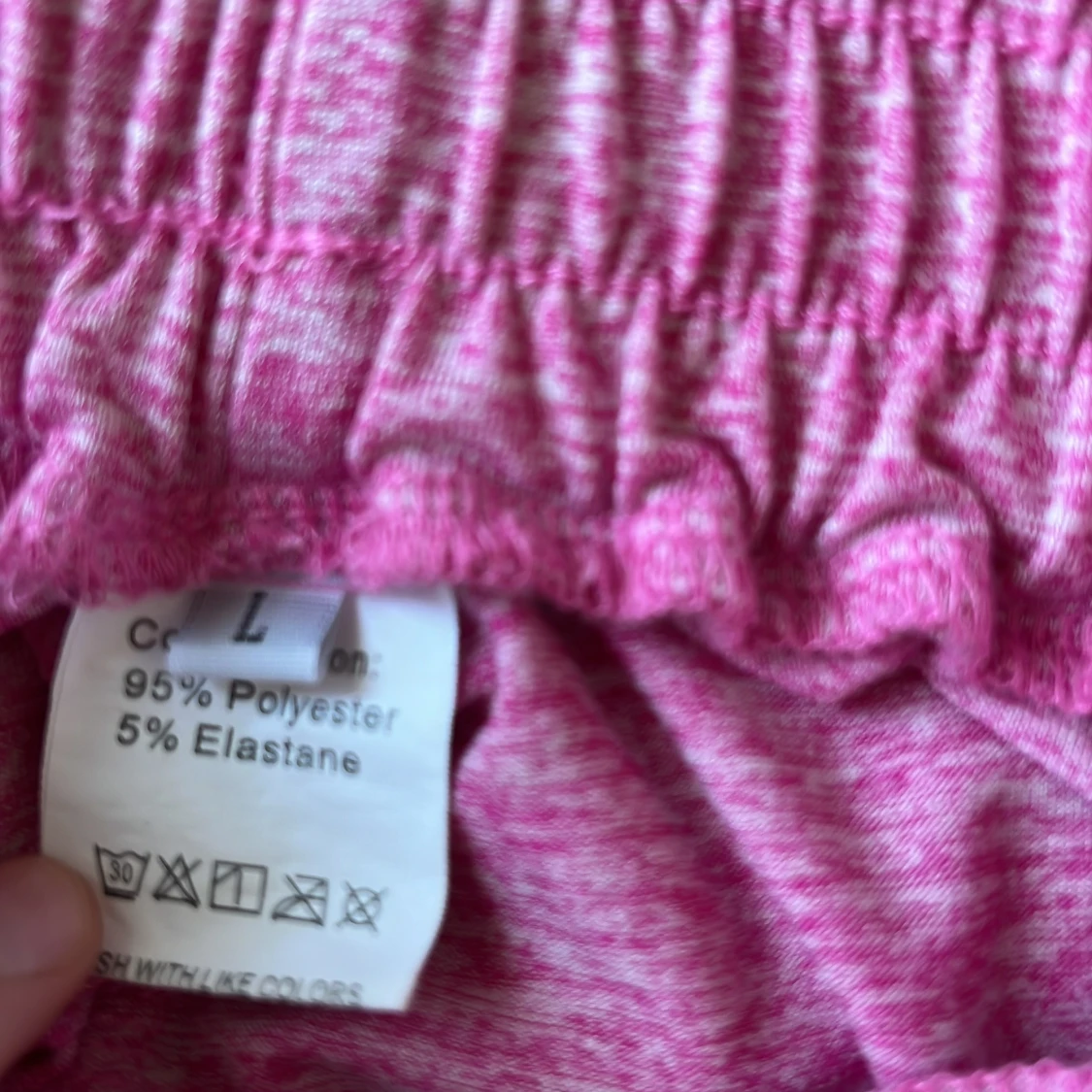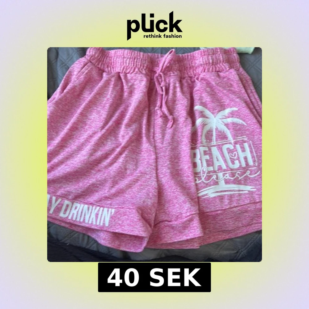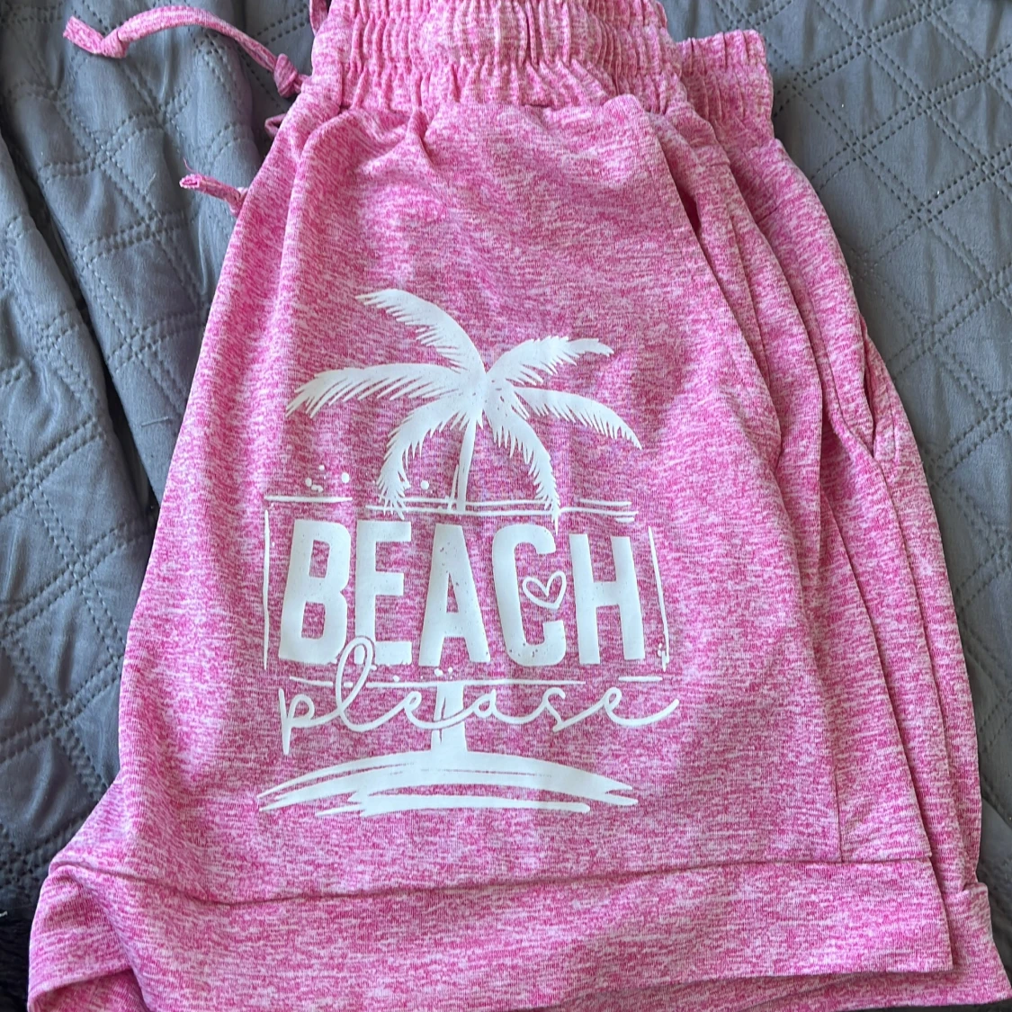Snygga rosa shorts med vit text och palmtryck där det står 'BEACH please'. De har elastisk midja med snörning och är tillverkade i mjuk, stretchig polyesterblandning. Perfekta för sommardagar på stranden eller chill hemma.