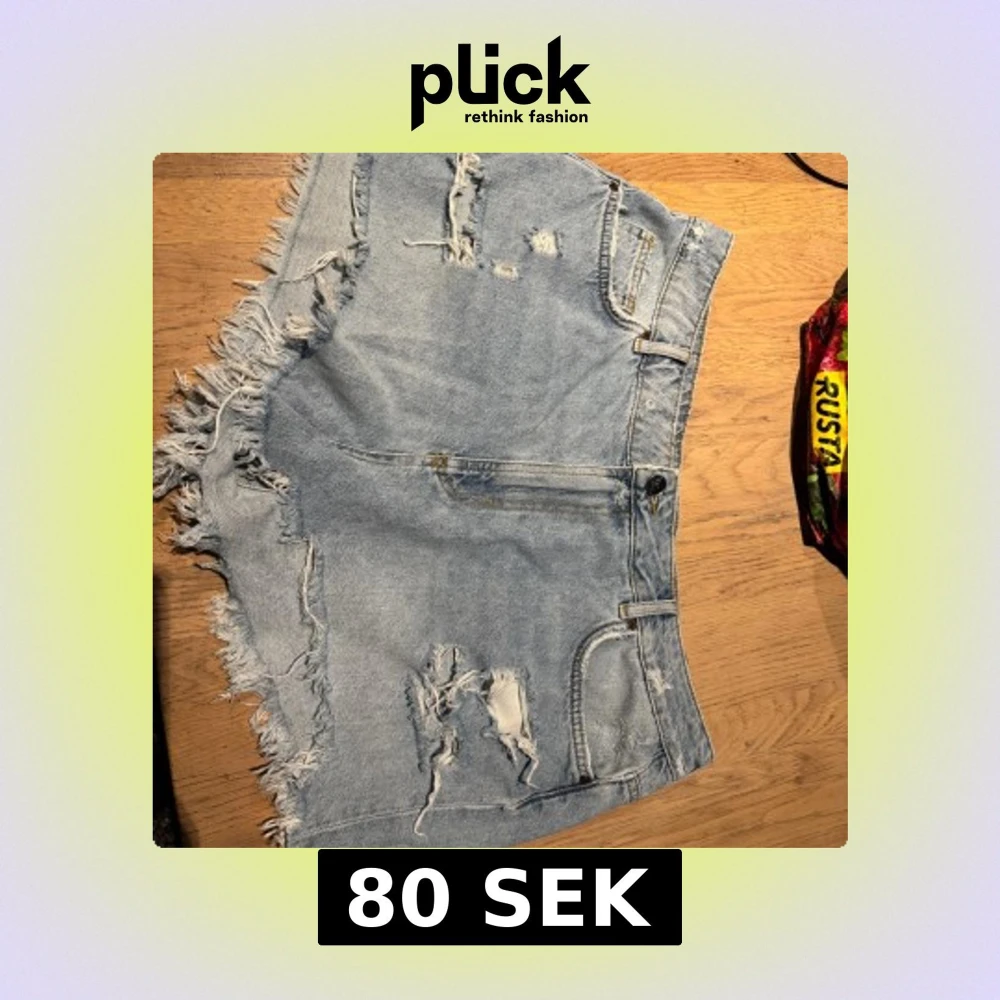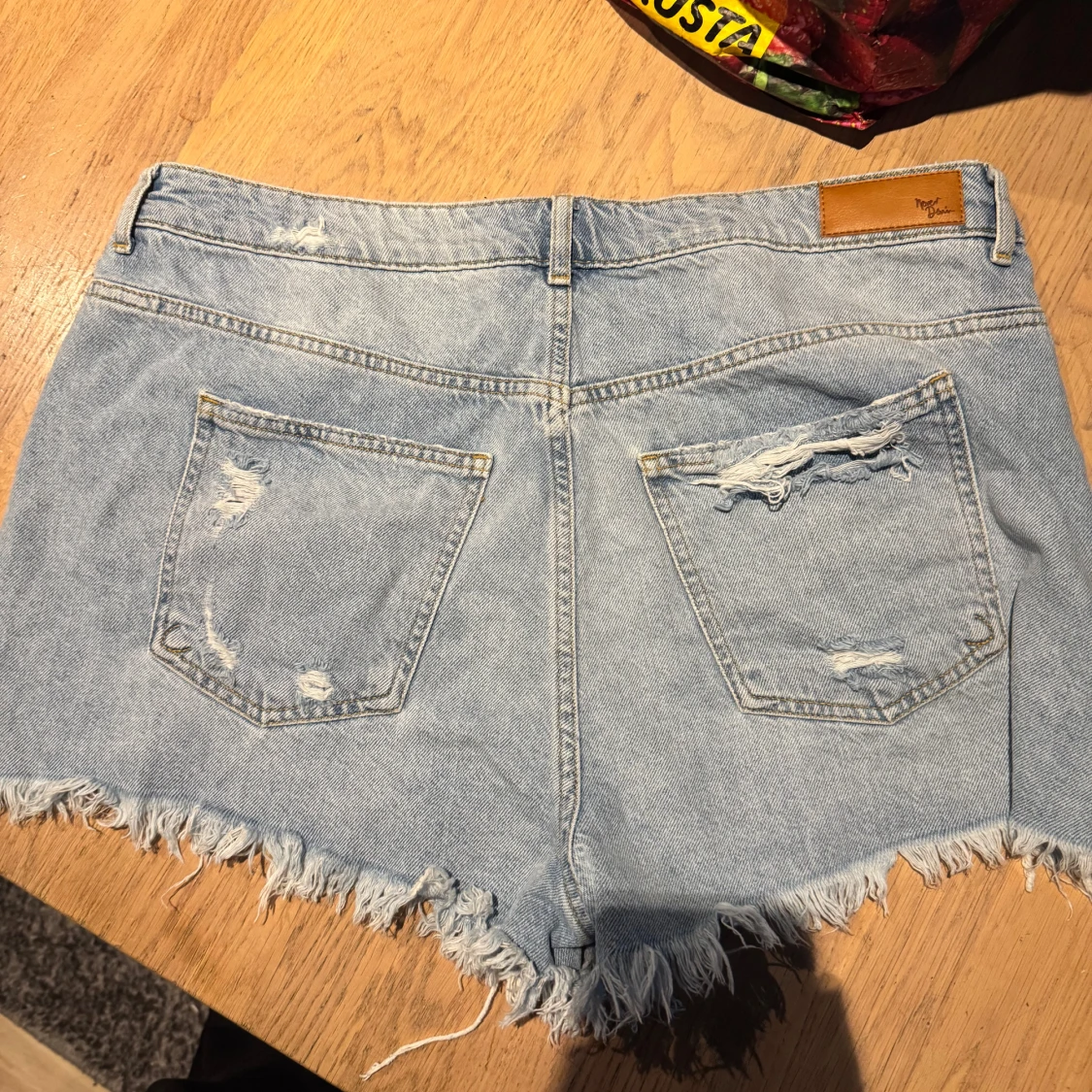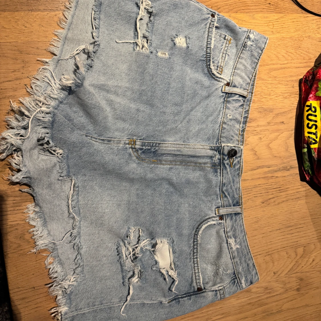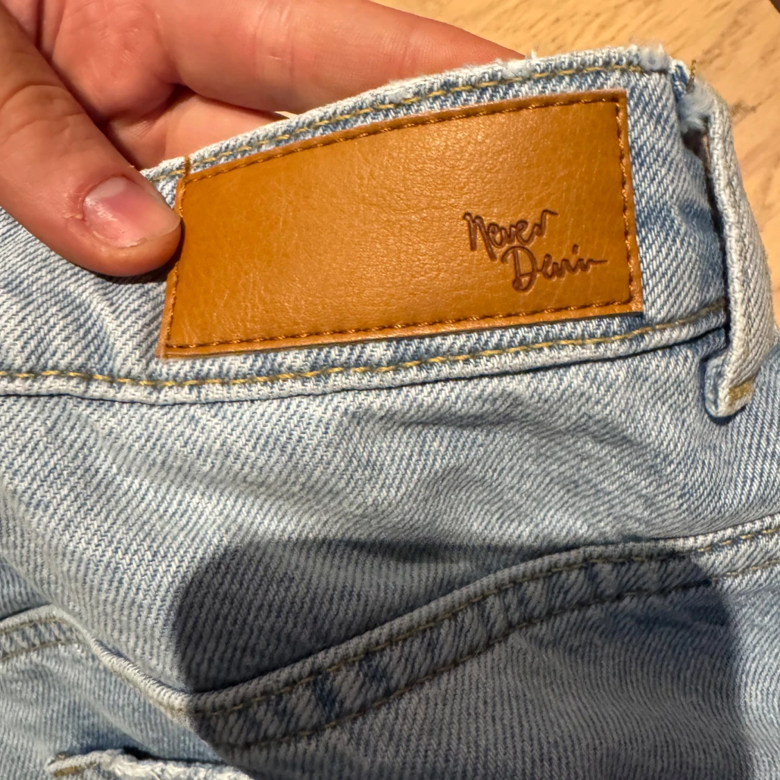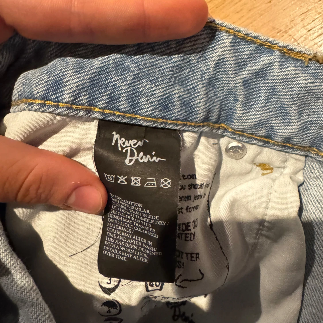 Snygga ljusblå jeansshorts från Never Denim med fransig kant och slitna detaljer både fram och bak. Loose fit som ger skön vibe. Oanvända 🫶🏻 är xl i storleken men är små, så mer som en L eller stor M