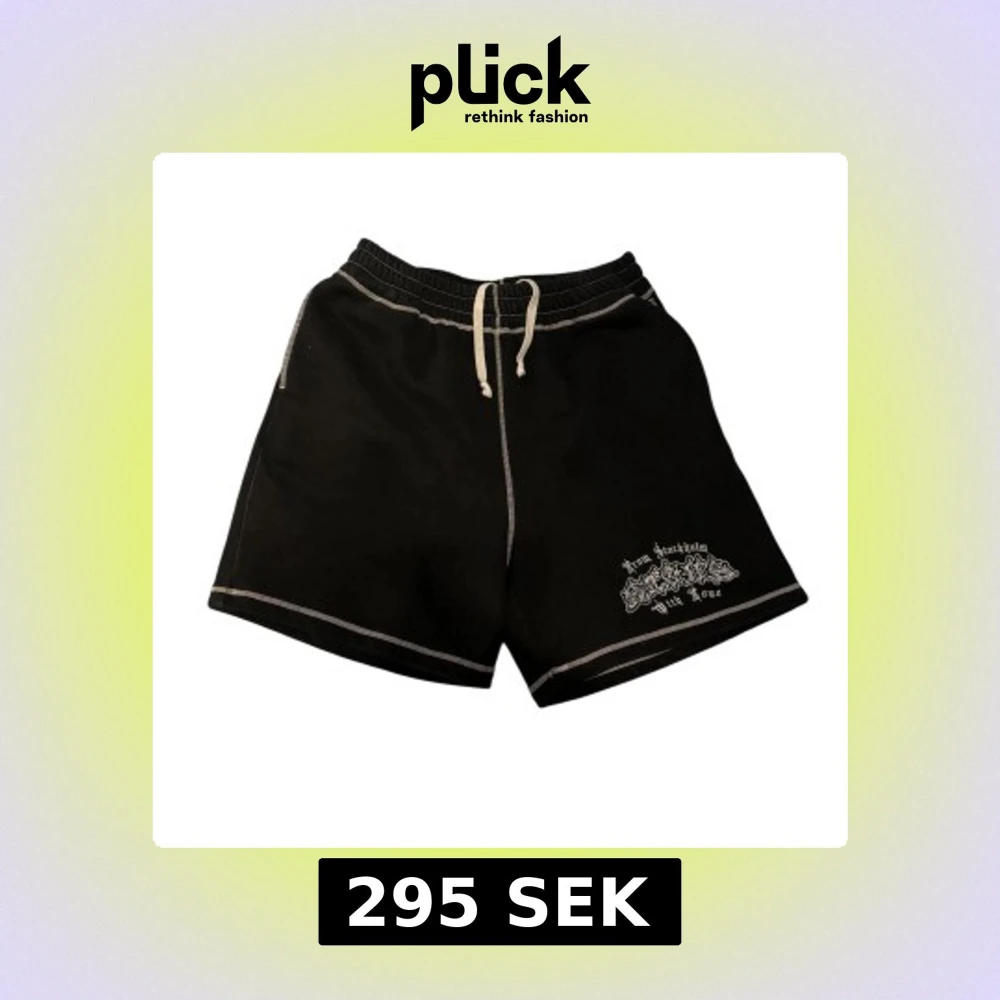 Svarta shorts från Seams med vita kontrastsömmar och snörning i midjan. Broderad text och motiv framtill samt en broderad hund på bakfickan. Perfekta för en avslappnad stil. Storlek L.