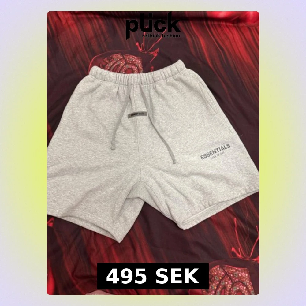 Säljer ett par grå mjuka shorts från Essentials Fear of God. De har elastisk midja med snörning, tryckt logga på framsidan och en bakficka. Passformen är loose och materialet är bomull, perfekt för chill dagar eller träning.
