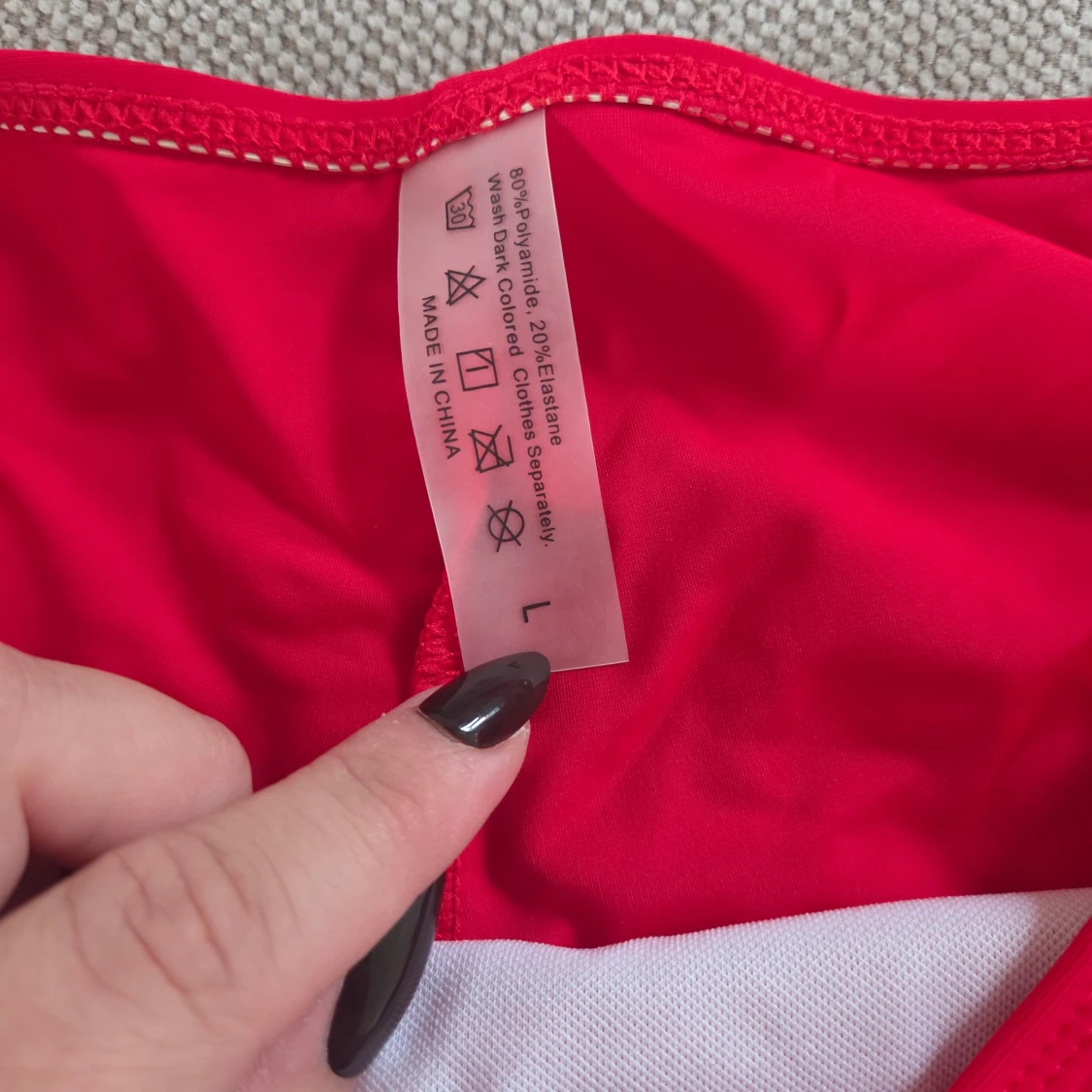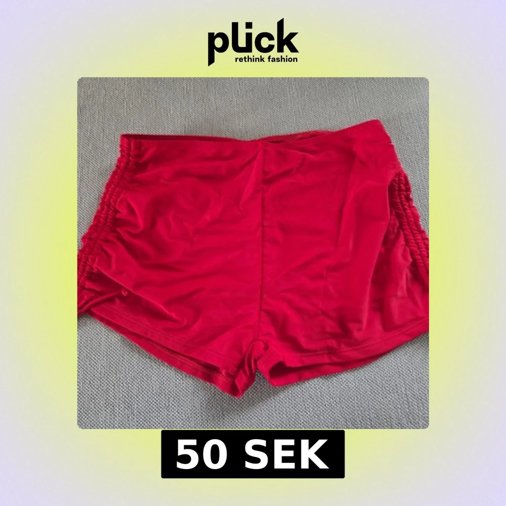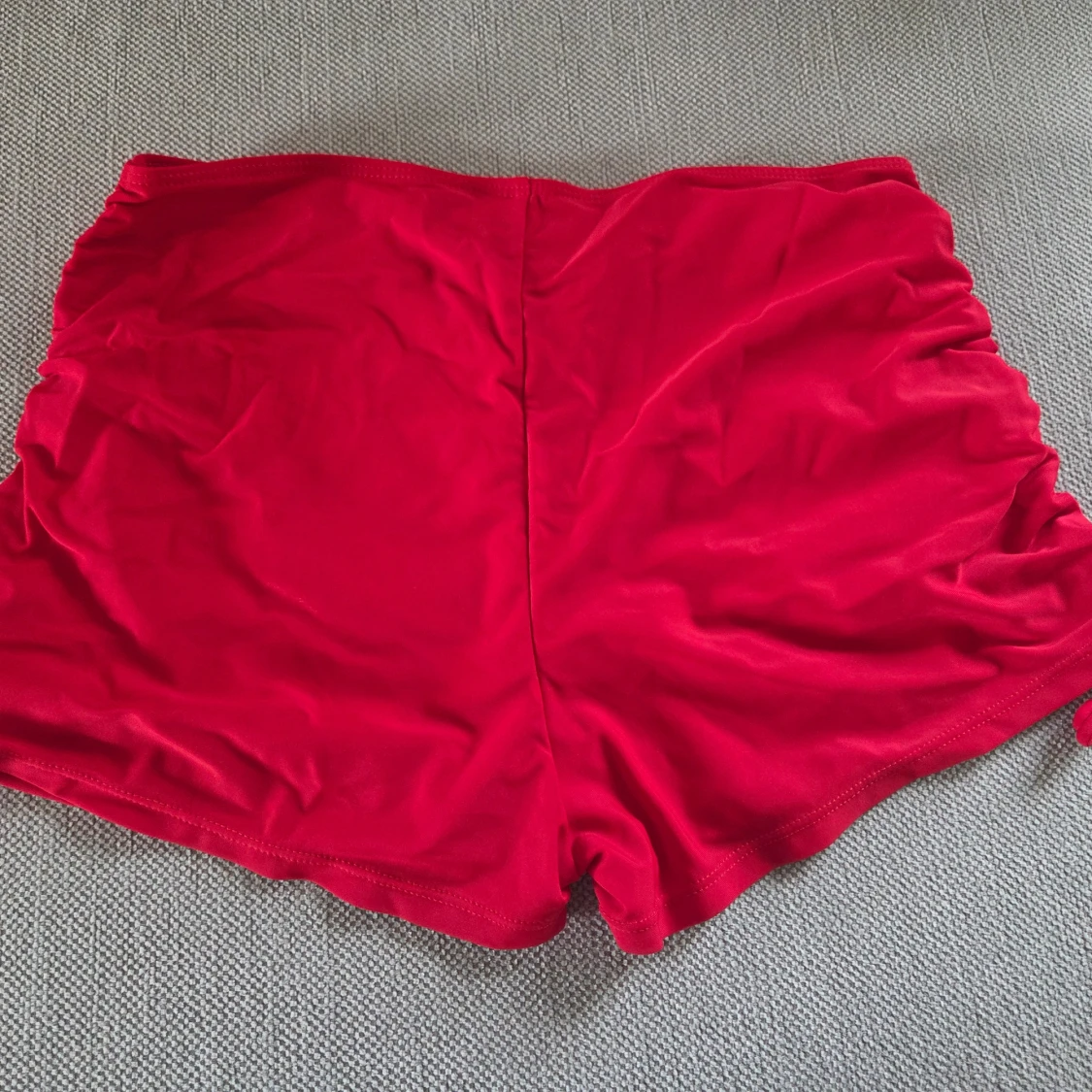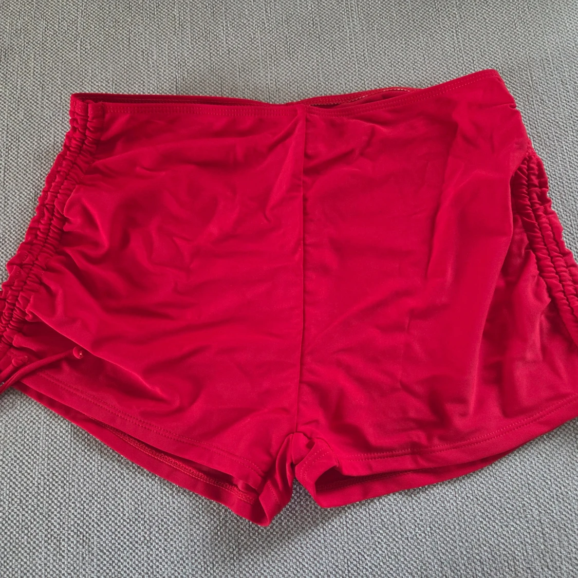 Snygga röda shorts med rynkade detaljer längs sidorna. De är tillverkade i ett stretchigt material som består av 80% polyamid och 20% elastan, vilket gör dem perfekta för träning eller bad. Modellen är kort och sitter tajt mot kroppen. Aldrig använda!