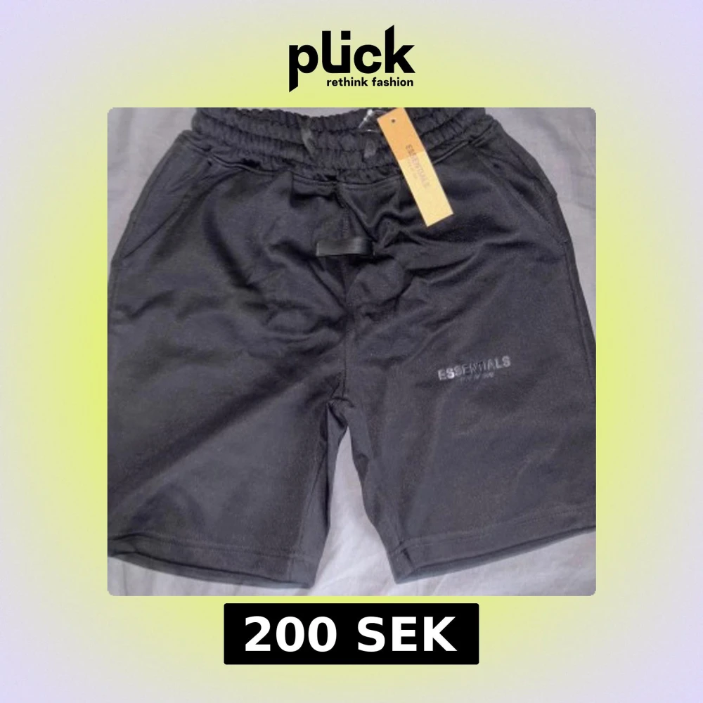 Svarta shorts från Essentials Fear of God med elastisk midja och snörning. Stilren design med diskret logga på vänster ben. Mjukt material som känns skönt mot huden och passar perfekt till chill eller träning. Klassisk passform och praktiska fickor på sidorna. Passar M också