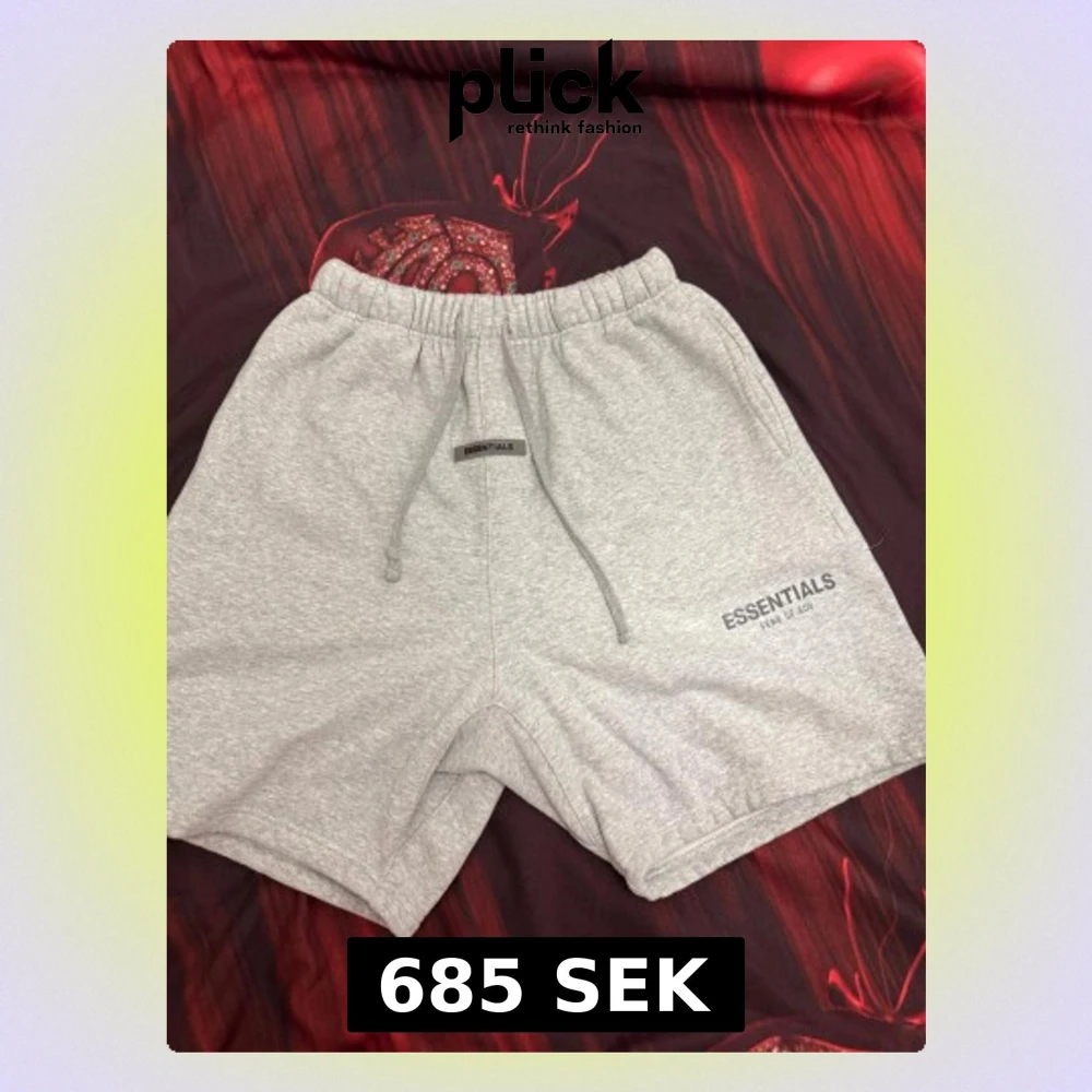 Snygga grå shorts från Essentials Fear of God med tryckt logga på benet och patch vid midjan. De har elastisk midja med snörning och en bakficka. Perfekta för chill eller streetwear, tillverkade i mjuk bomull för skön komfort.