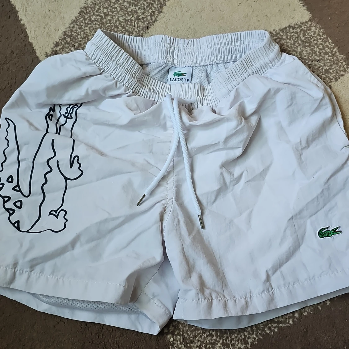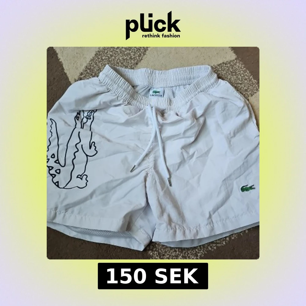 Snygga vita badshorts från Lacoste. De e sköna att ha på. Den är använd några gånger och är i bra skick.