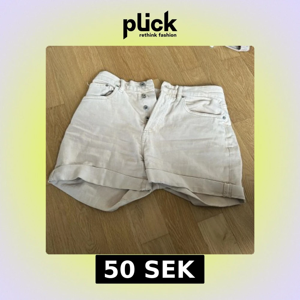Snygga beige jeansshorts från lager 157 i storlek M. Modellen är högmidjad med klassiska fem fickor, uppvikta benslut och knäppning med flera knappar framtill. Perfekta för varma dagar och enkel att matcha med allt.