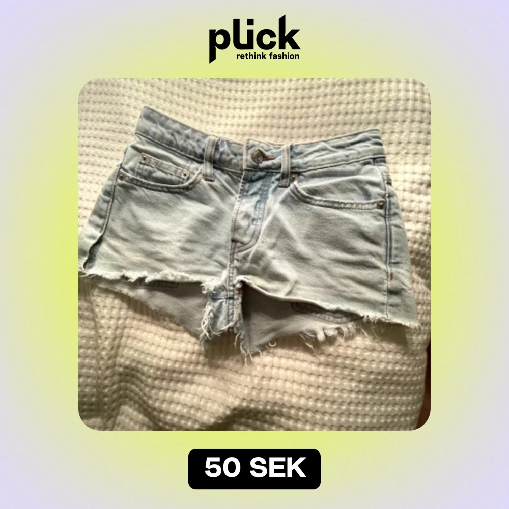 Ljus blåa jeans shorts som är lågmidjade, har ett litet håll i sidosömem, ej något som märks av.