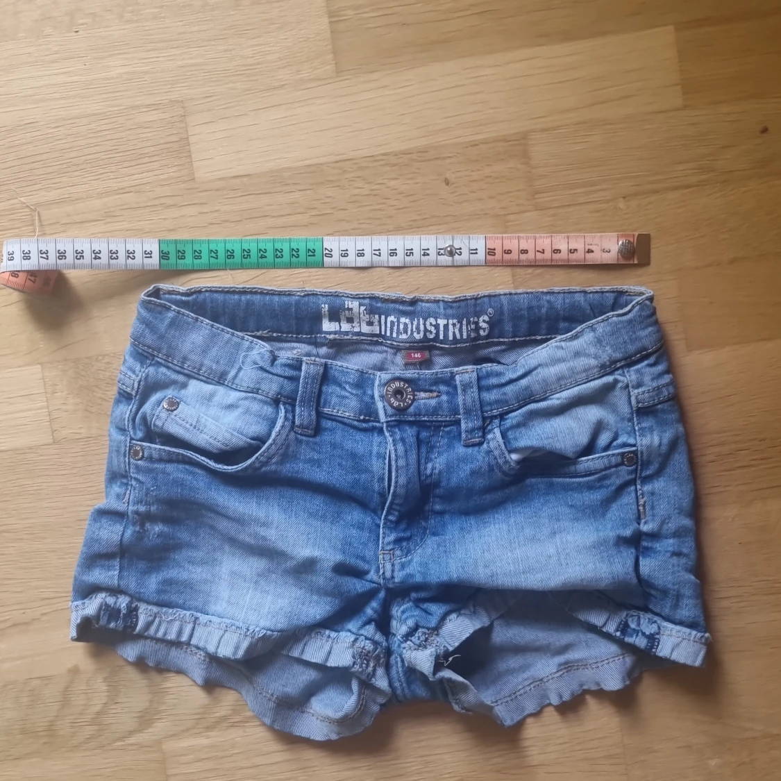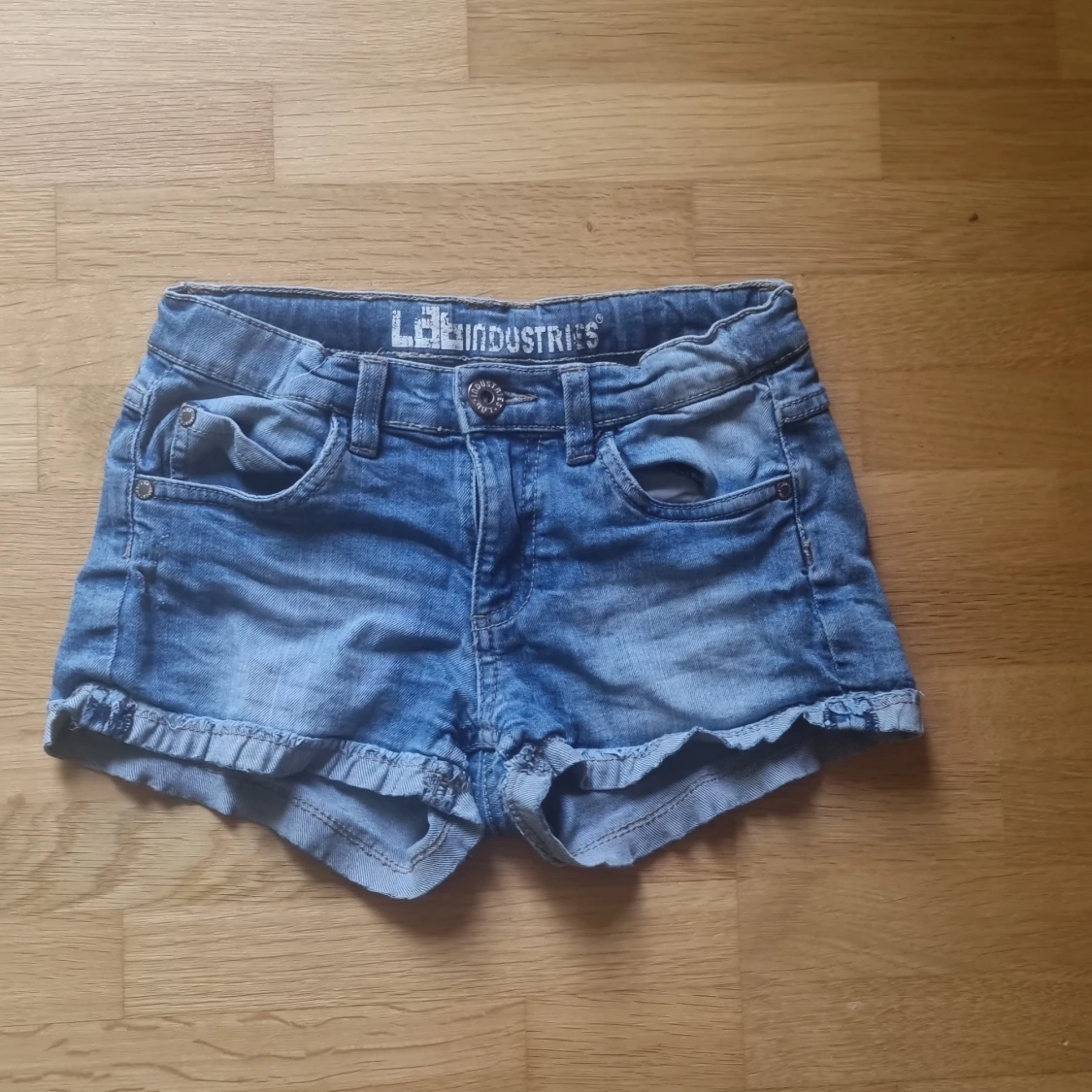 Snygga blå jeansshorts från Ldl Industries med klassisk femficksdesign, uppvikta ben och slitna detaljer. Shortsen har normal passform, bälteshällor och knappstängning framtill. Perfekta för varma sommardagar och en avslappnad look.