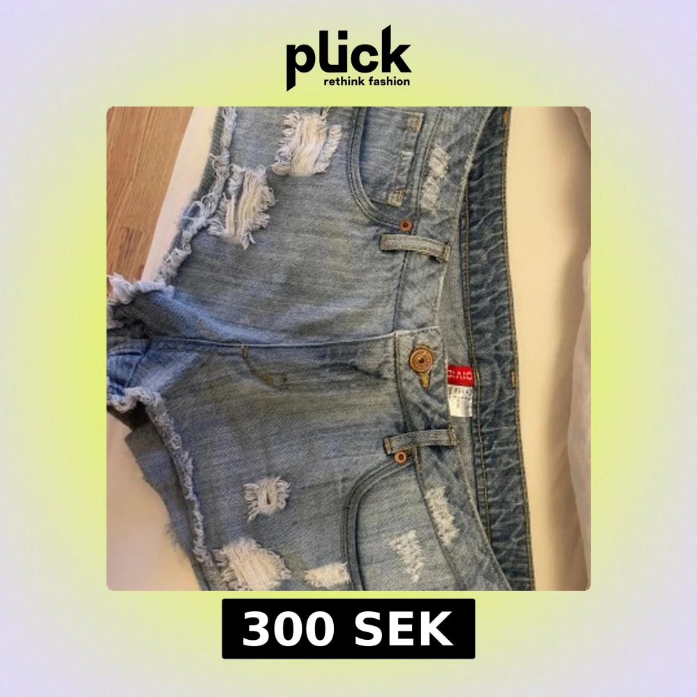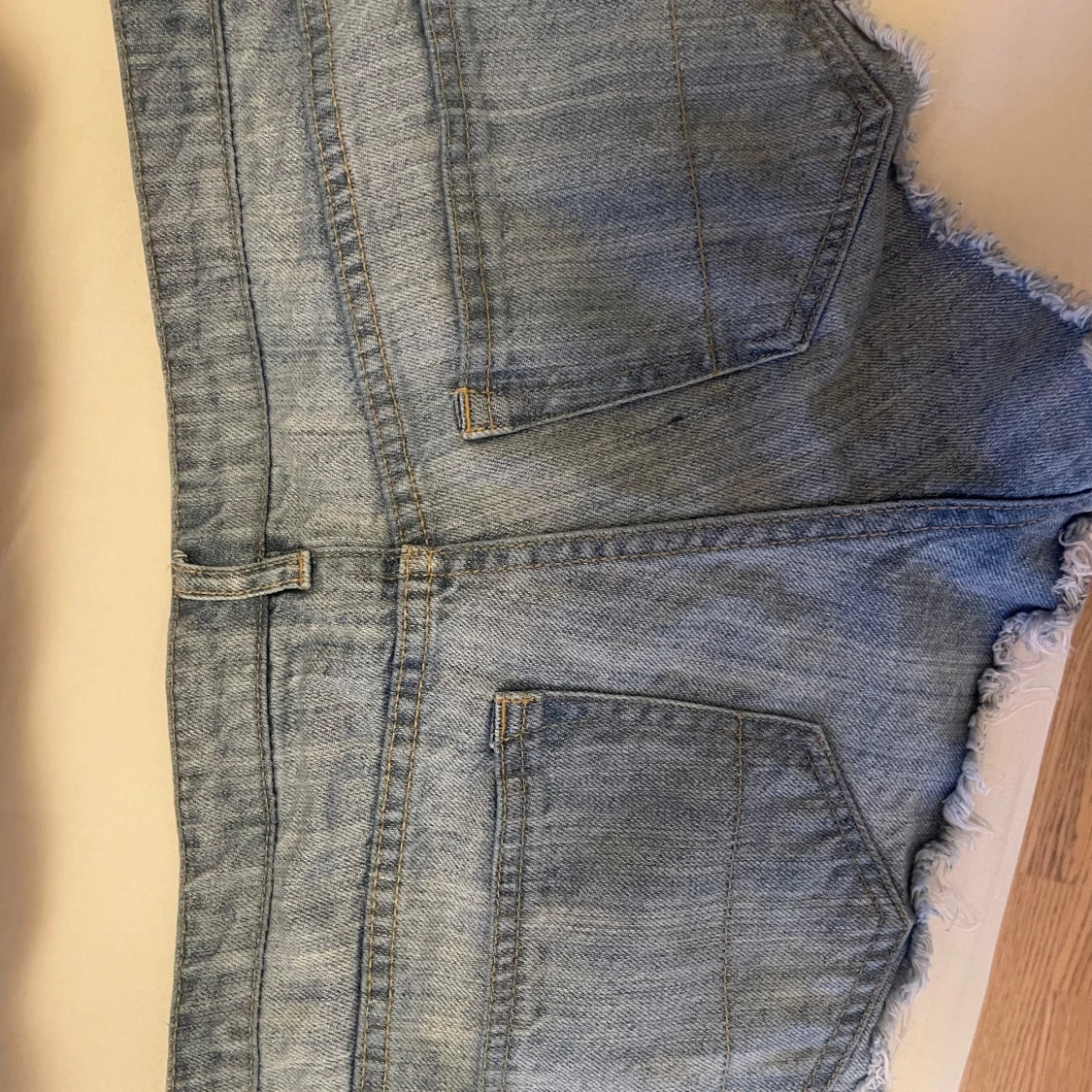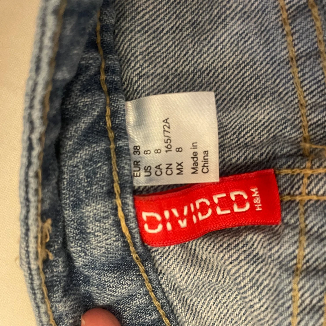 Säljer ett par ljusblå jeansshorts från H&M Divided med slitna detaljer och fransig kant. De är Lågmidjade och har 39cm i midjemått