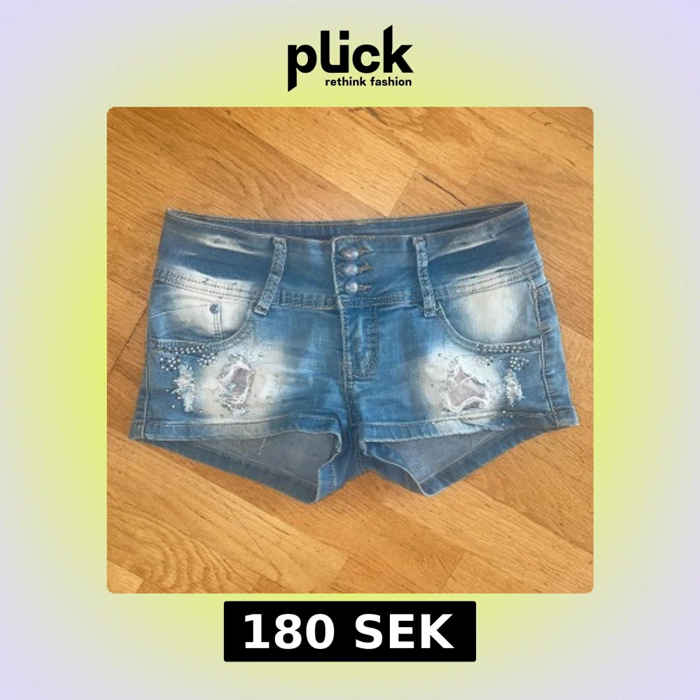 Snygga blå jeansshorts med slitningar framtill, pärldetaljer och dekorativa knappar. Ena bakfickan har vit spets med blommönster. Perfekta för sommaren och har en normal passform. Midjemått: 36cm men stretchiga! Kontakta vid frågor😇