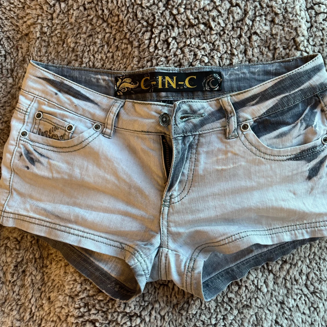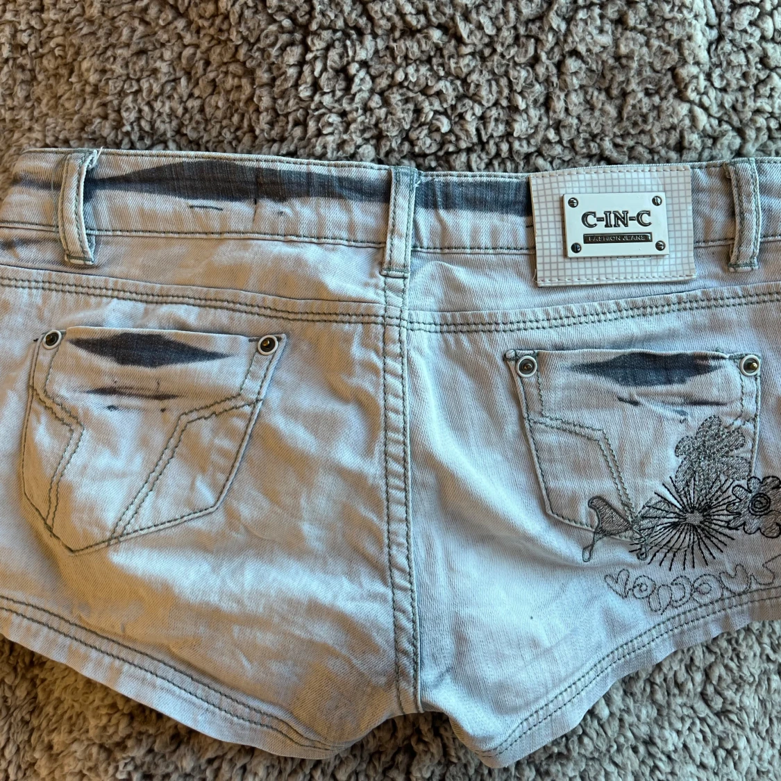 Snygga blå jeansshorts med coola slitningar och broderad detalj på baksidan. De har en låg midja och klassisk femficksdesign. Kolla gärna in mina andra shorts jag har lagt upp. Midjemåttet är ca 38cm tvärsöver💕