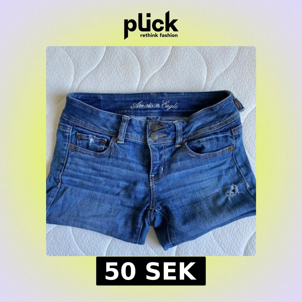 Snygga blå jeansshorts från American Eagle med låg midja och kort passform. dubbla knappar, rå kant nedtill. Väldigt Stretchigt denimmaterial som sitter skönt och formar sig efter kroppen. 📏mått: ca 38-39 cm rakt över
