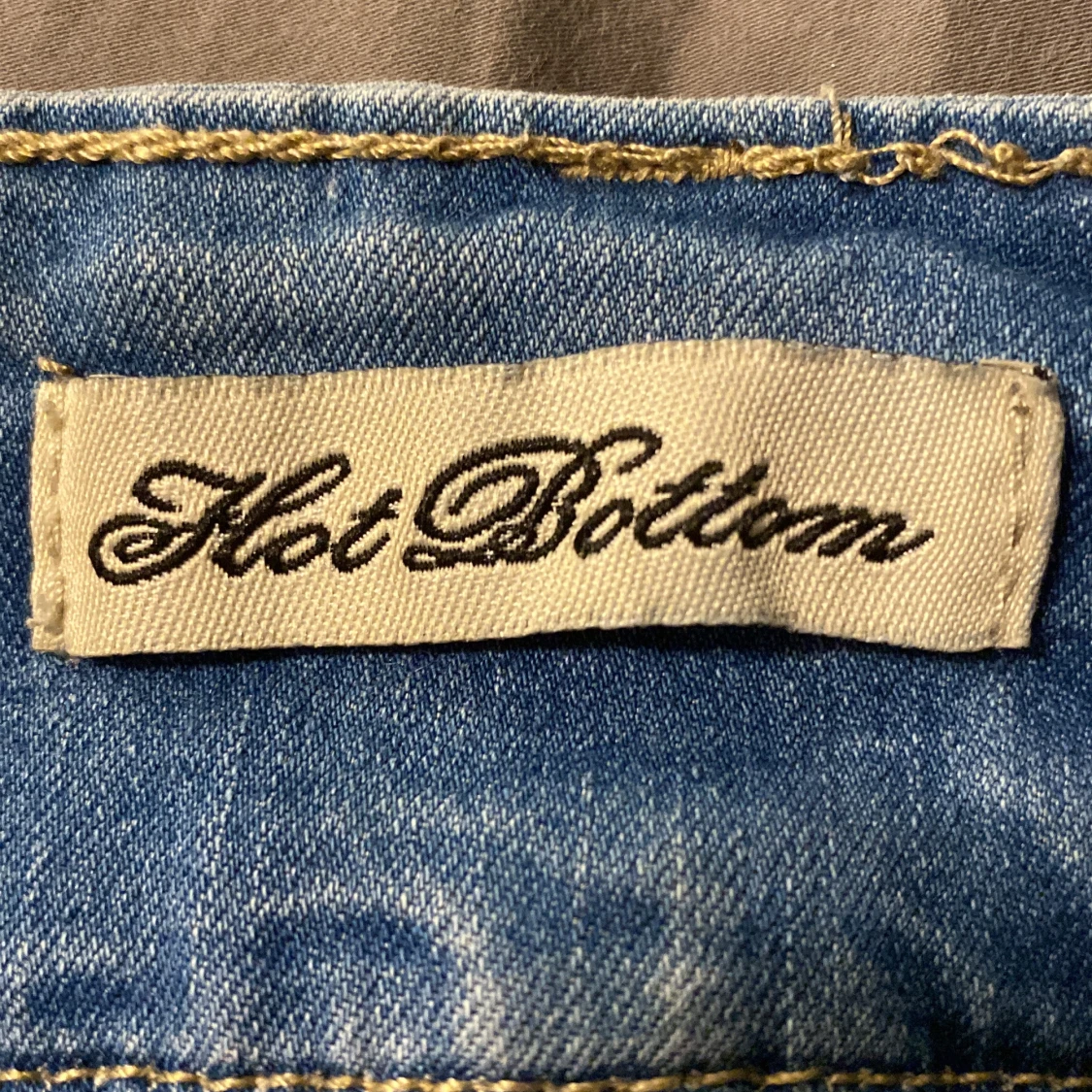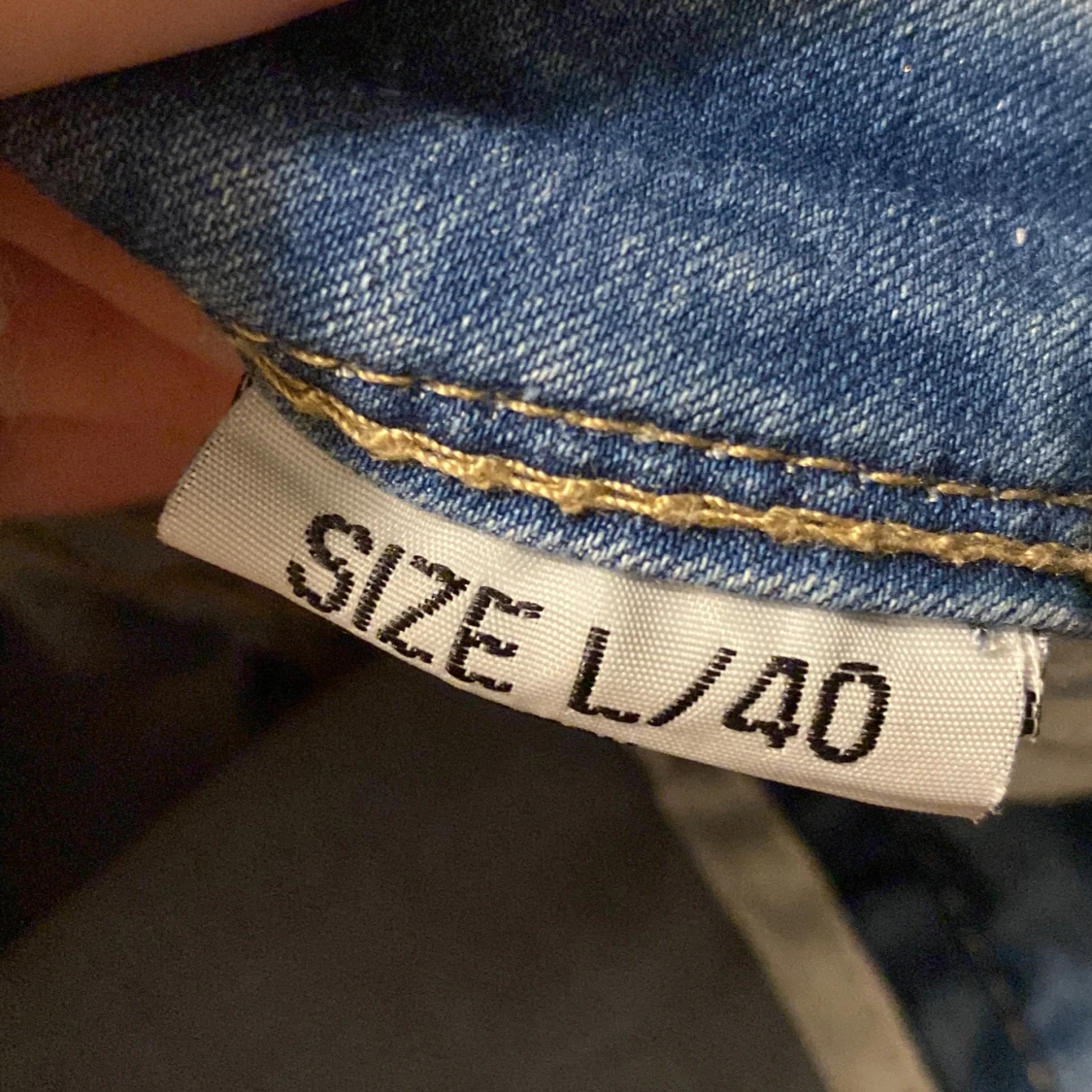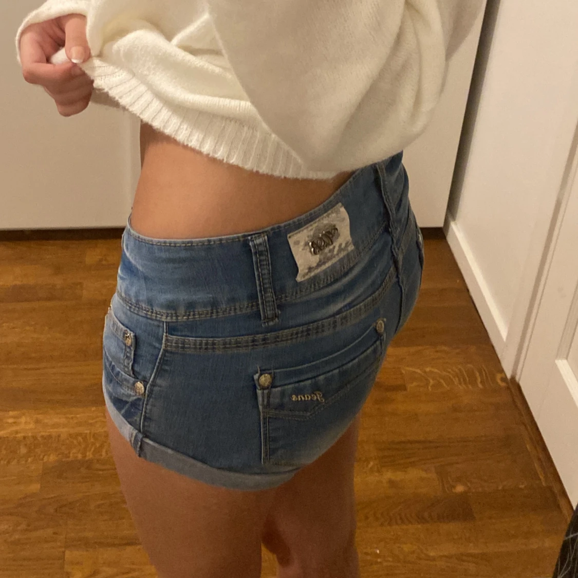 Säljer ett par blå jeansshorts från hot bottom i storlek L/40, men passar mig som bär 38 perfekt. De är lågmidjade med två knappar framtill, snygga detaljer på fickorna och uppvikta benslut. Midjemått: 38cm