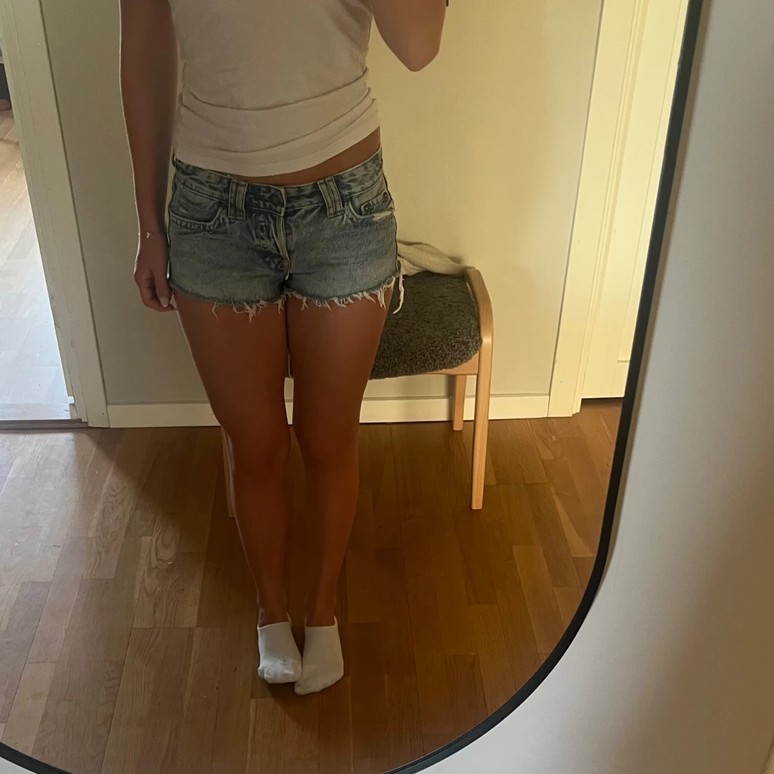 Snygga lågmidjade jeansshorts i ljusblå tvätt med slitna kanter och fransar samt snygga fickor baktill. Använda fåtal gånger