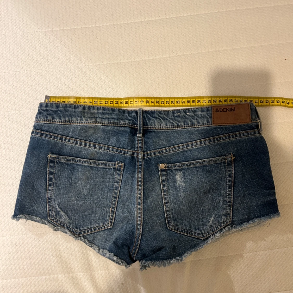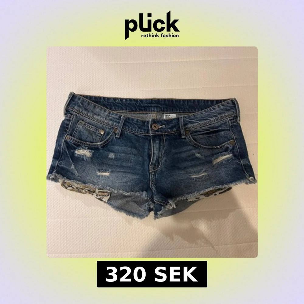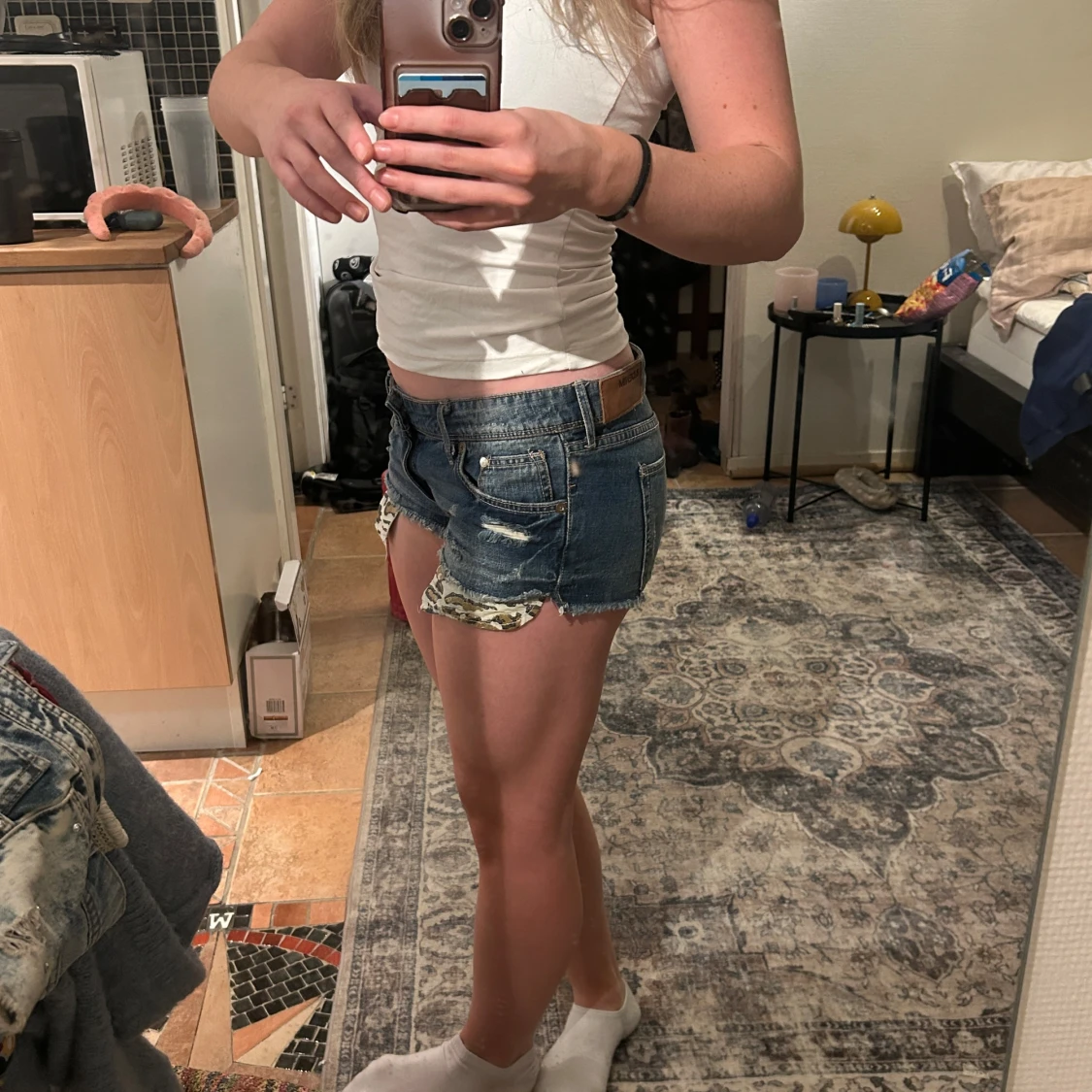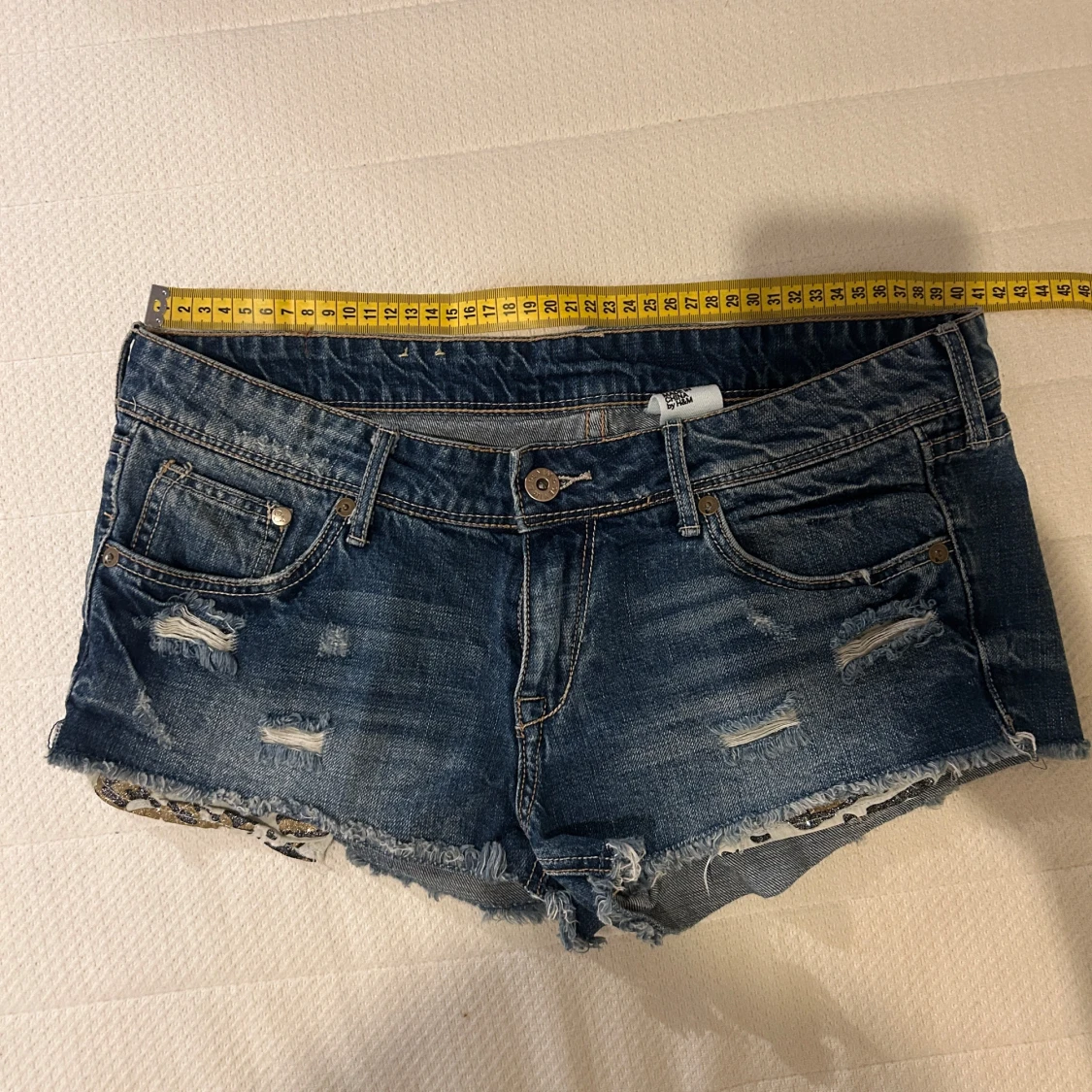 Lågmidjade jeansshorts, gammal modell från hm. Fickorna sticker ut vid shorts benet och har leopardmönster. Storleken är 38, sitter mer som S💕 se sista bilderna för midjemått!