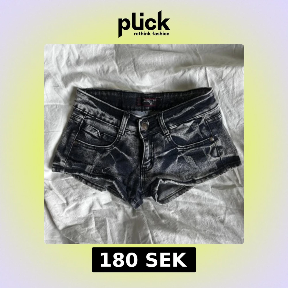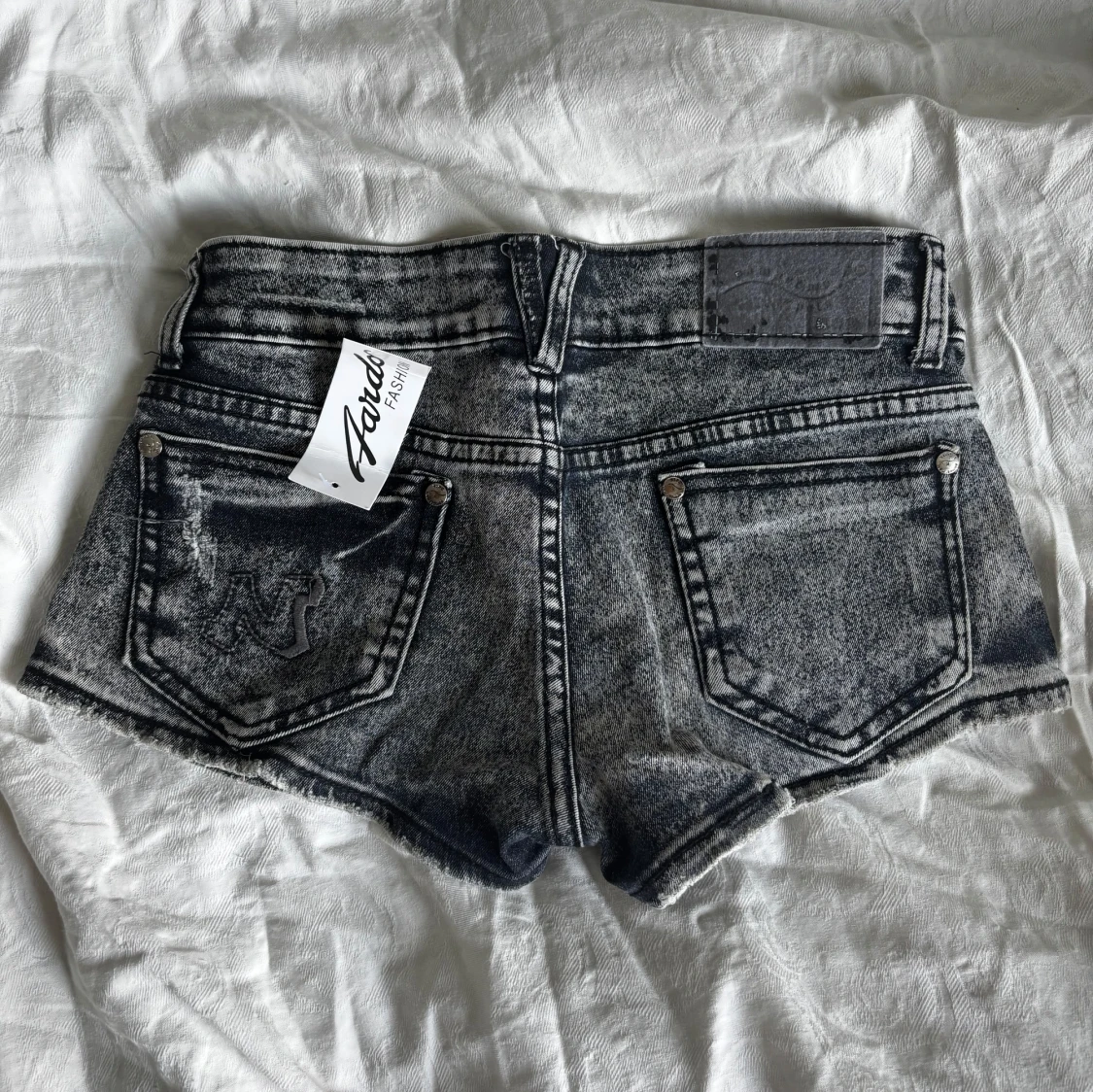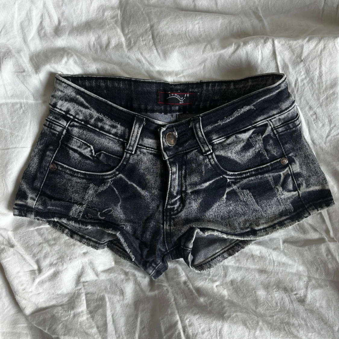 Snygga svarta jeansshorts, låg midja och coola slitna detaljer. Köpta på second hand med prislappen kvar.