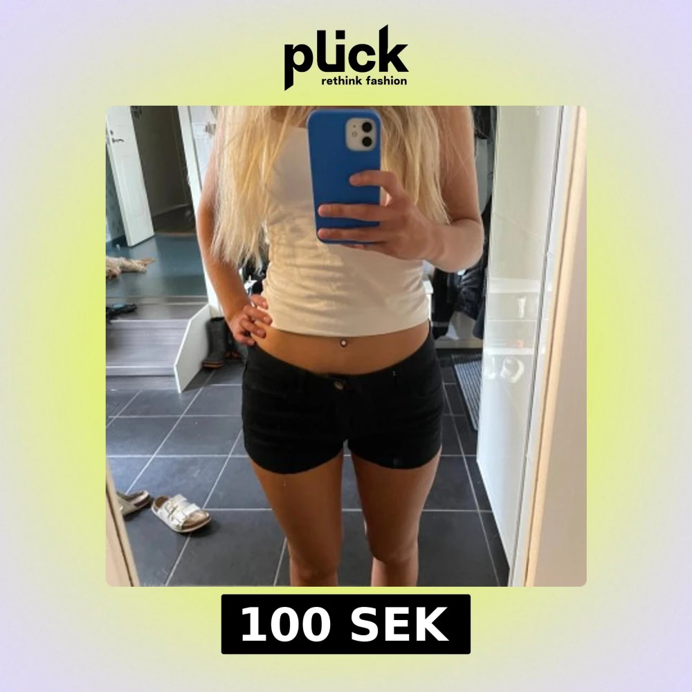 Säljer ett par svarta, tighta shorts med låg midja och klassisk jeanslook. De har fickor både fram och bak samt stängs med knapp och dragkedja. Perfekta för varma sommardagar och passar till det mesta. Snygg och enkel stil som är lätt att matcha. Har klippt av de så att de skulle bli kortare, därav priset!