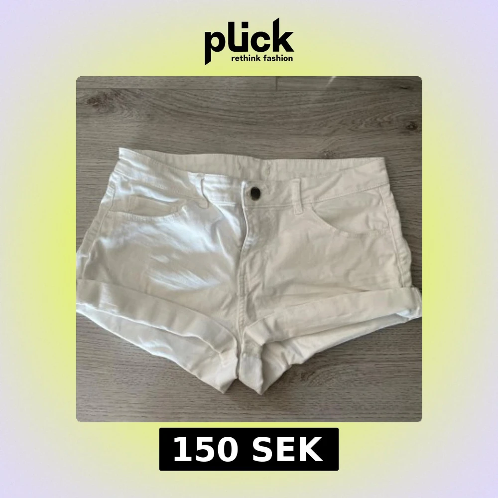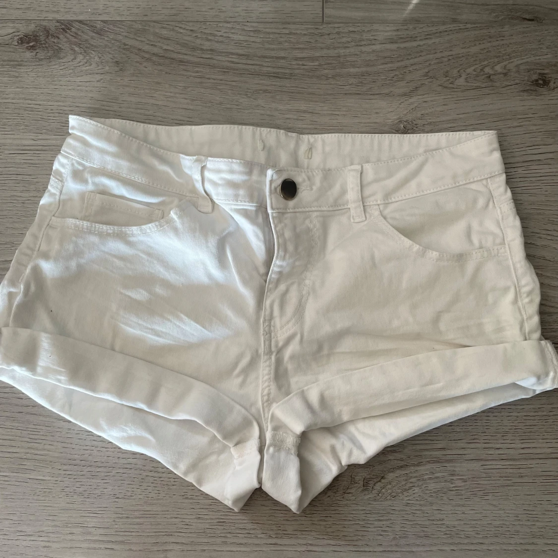 Snygga vita jeansshorts med midwaist passform och klassisk femficksdesign. De har uppvikta benslut, bälteshällor och knappstängning framtill. Perfekta för varma dagar och en clean look. Materialet är mjukt och bekvämt bomullstyg.