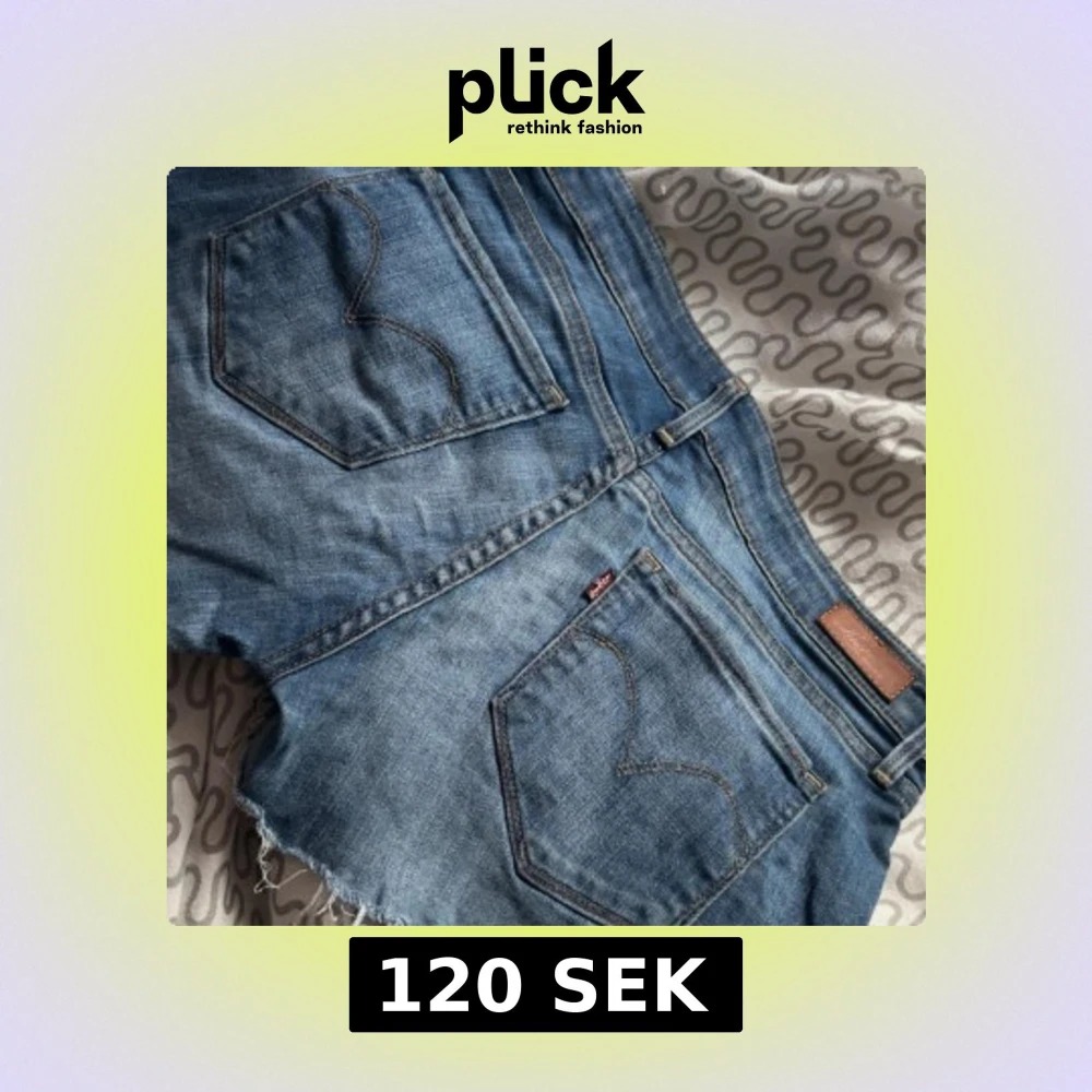 Säljer ett par klassiska blå jeansshorts från Levi's med råa, fransiga kanter och femficksmodell. Modellen är Bold Curve och storleken är 31. Perfekta för en avslappnad stil.