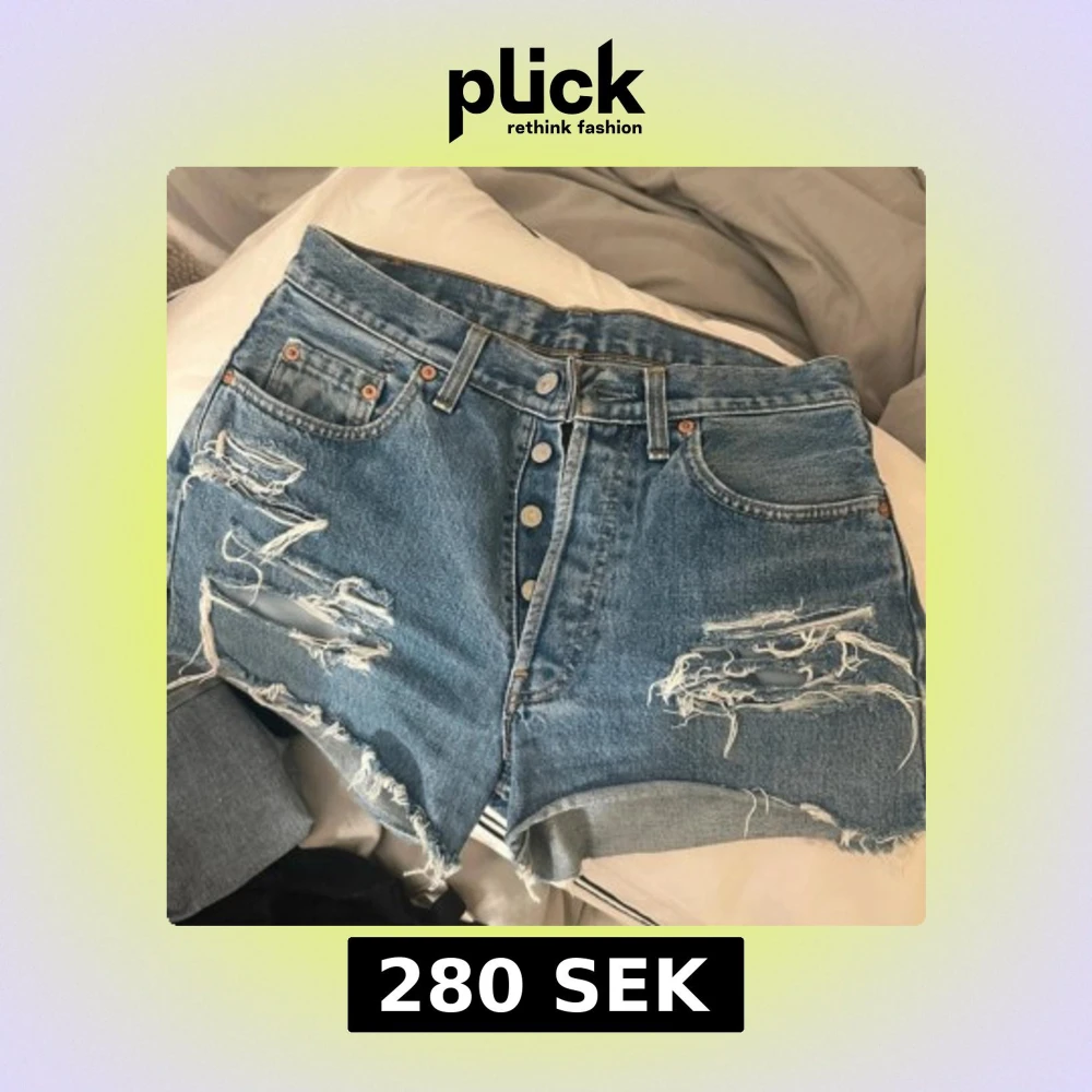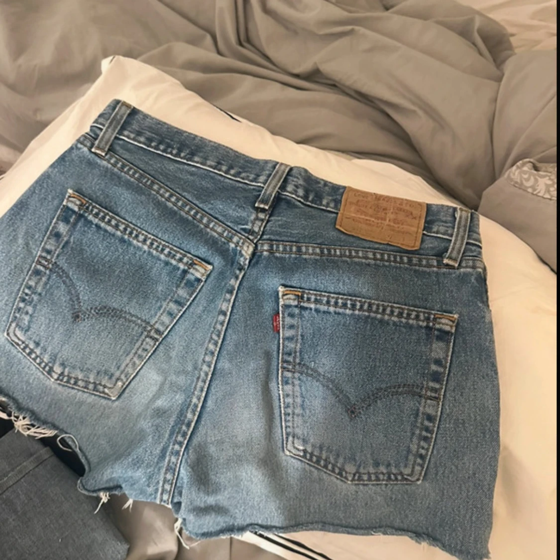 Snygga blå jeansshorts från Levi's med hög midja och slitna detaljer framtill. Klassisk femficksmodell, knappar i gylfen och råa kanter nertill för en avslappnad vibe. Perfekta för sommaren och ger en cool, vintage känsla.