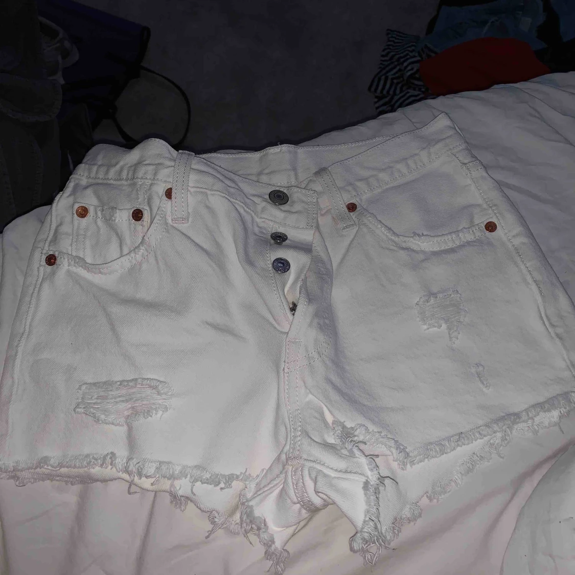 Säljer mina vita Levis shorts som aldrig är använda. Köpta ifrån Nelly med lite slitningar i fram.