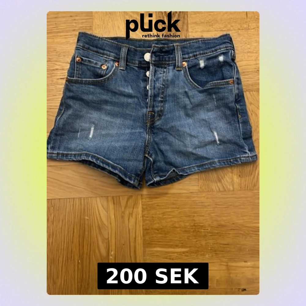 Säljer ett par klassiska blå jeansshorts från Levi's med hög midja och slitna detaljer. Shortsen har fem fickor, knappgylf.